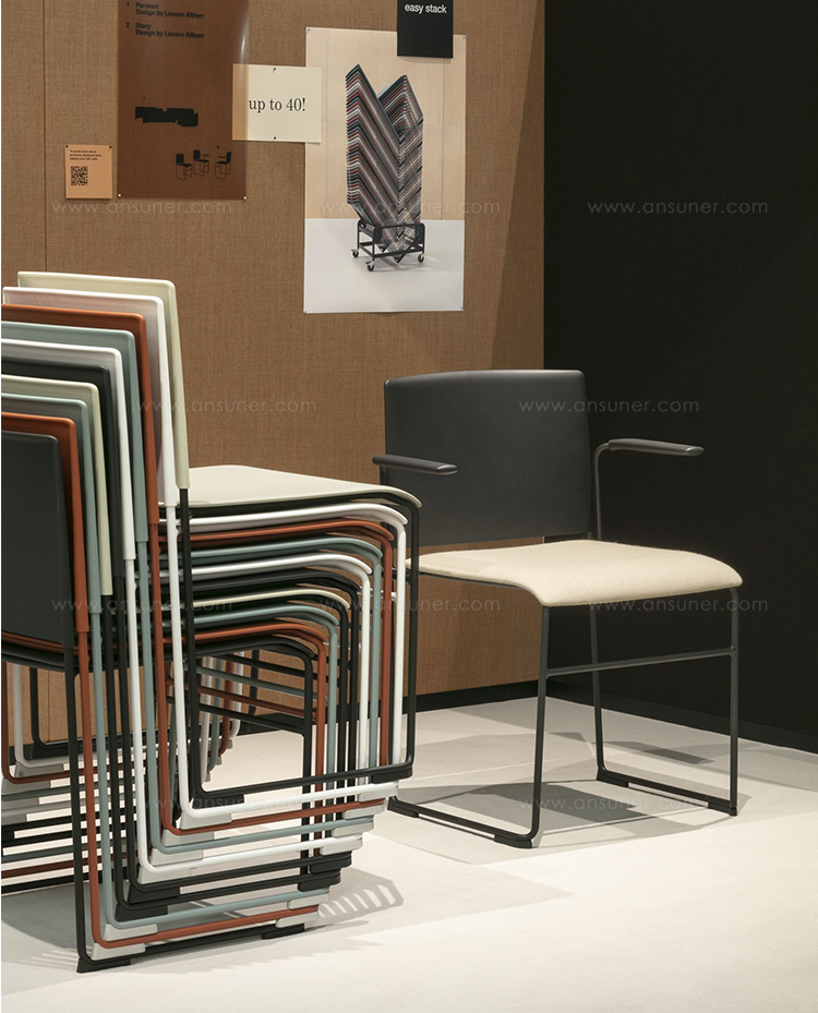 Stacy系列融合了功能与低调的优雅。基本形式重量仅为5.5千克。它可以堆放多达40把椅子,便于在大学,会议室,礼堂,教堂或公共场所等临时和即兴座位环境中运输。雪橇底座有镀铬或涂有四种不同颜色,有或没有扶手;外壳采用聚丙烯制成,带软垫座椅或全软垫或防火塑料饰面。或者通过组合不同的座椅和靠背饰面选项来创建定制材料配对:monocolor,彩色座椅和靠背,或带有彩色背部的黑色座椅。一套附件选项,包括左侧或右侧可拆卸书写板,连接系统,行间隔器,编号系统和用于堆叠的手推车,增强了Stacy的功能,而舒适的瀑布座椅形状和柔和的倾斜靠背等精致细节使其非常实用主持任何基本的东西。