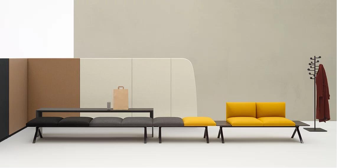 Kiik是一个模块化系统,由各种尺寸的框架组成,可与垫子结合,可提供或不提供63x63 cm靠背,座位高度为45 cm。Kiik桌子有不同的形状和尺寸(矩形、方形、三角形、四分之一圆形),因此允许线性和L形模块(120°和90°)。该系列的补充是一个控制台与252x40厘米的三个高度顶部:58,72 e 105厘米,和126x157.5厘米的座椅高度36厘米的搁脚凳。