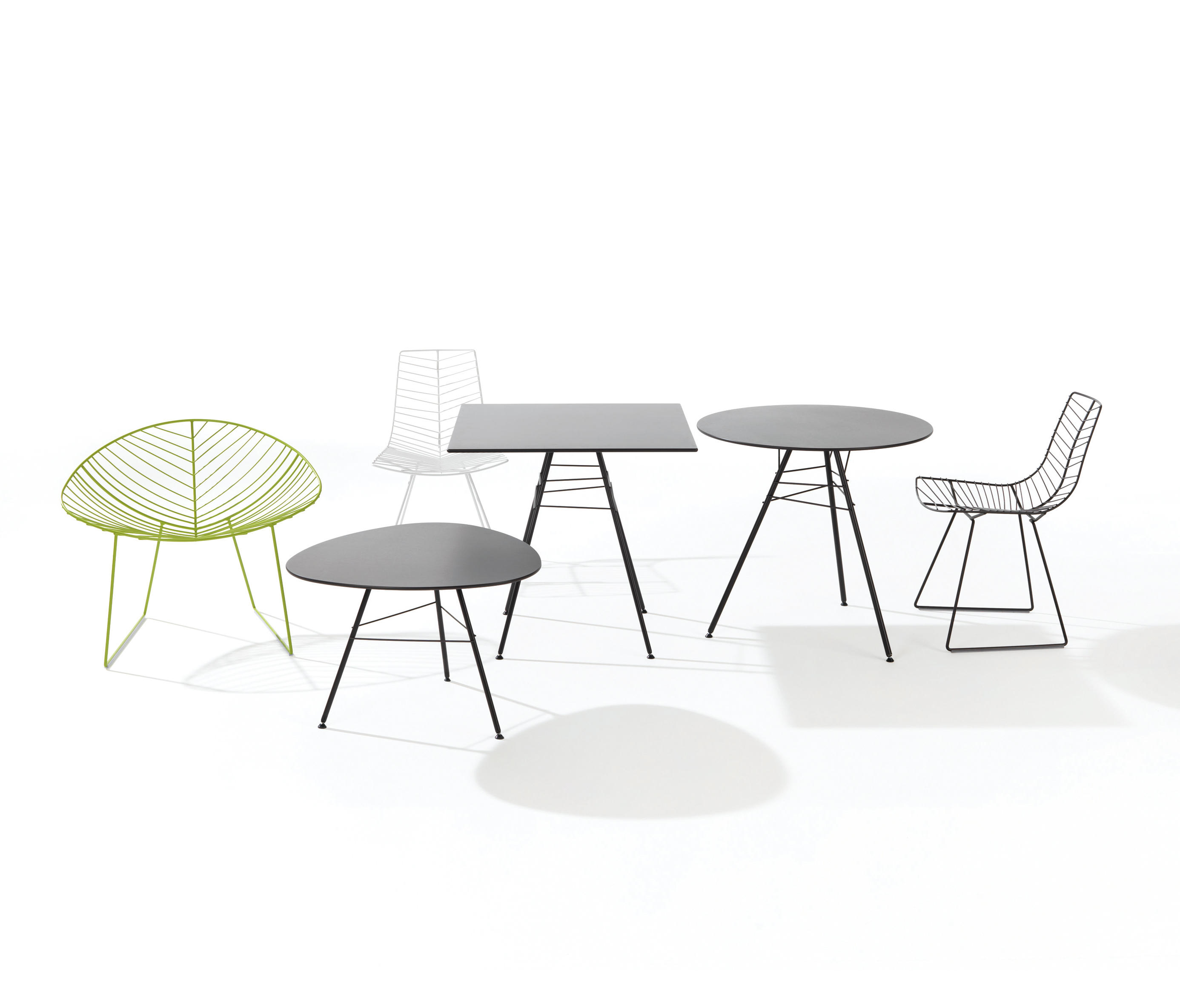 基座有三脚或四脚。全部采用白色,摩卡或绿色涂漆钢材制成。防水HPL上衣有灰色可供选择。