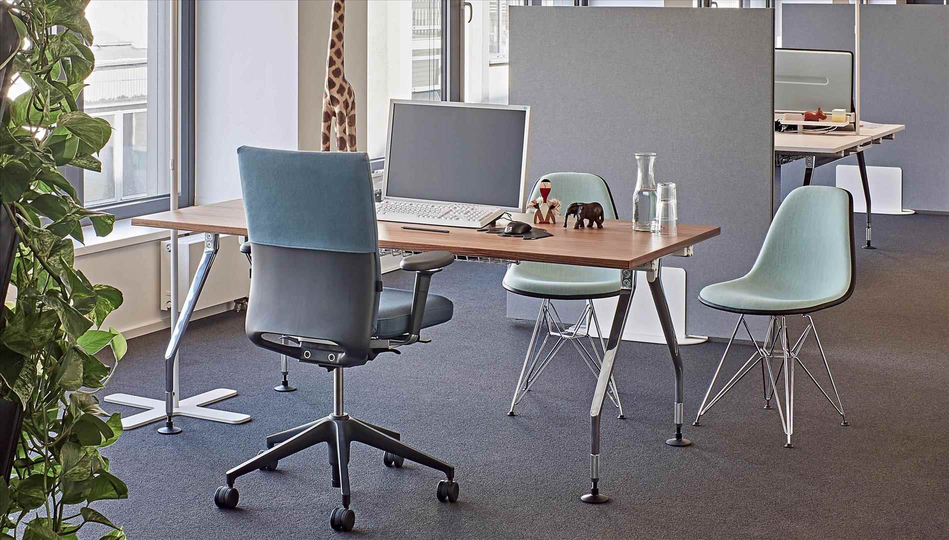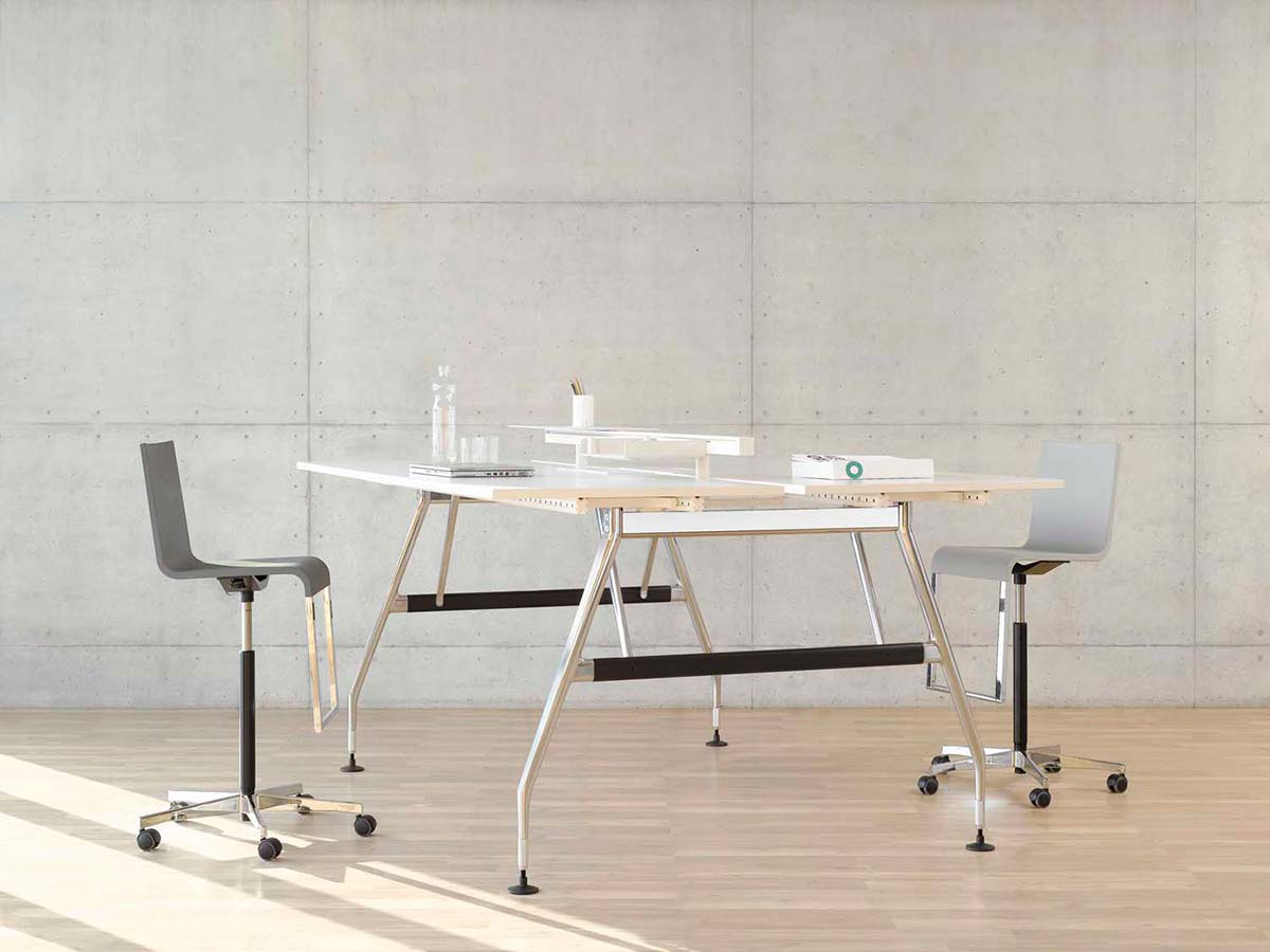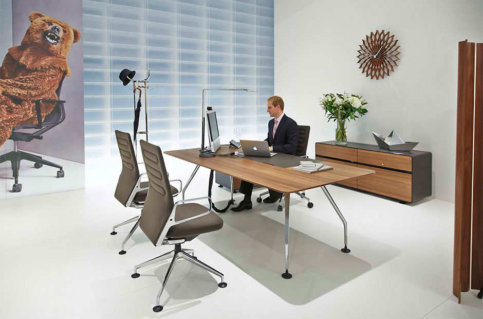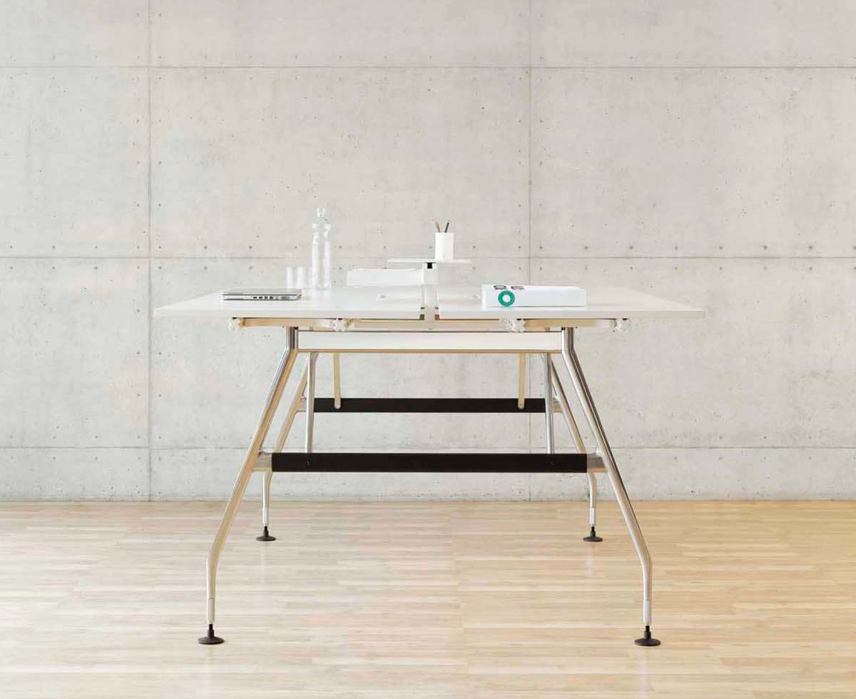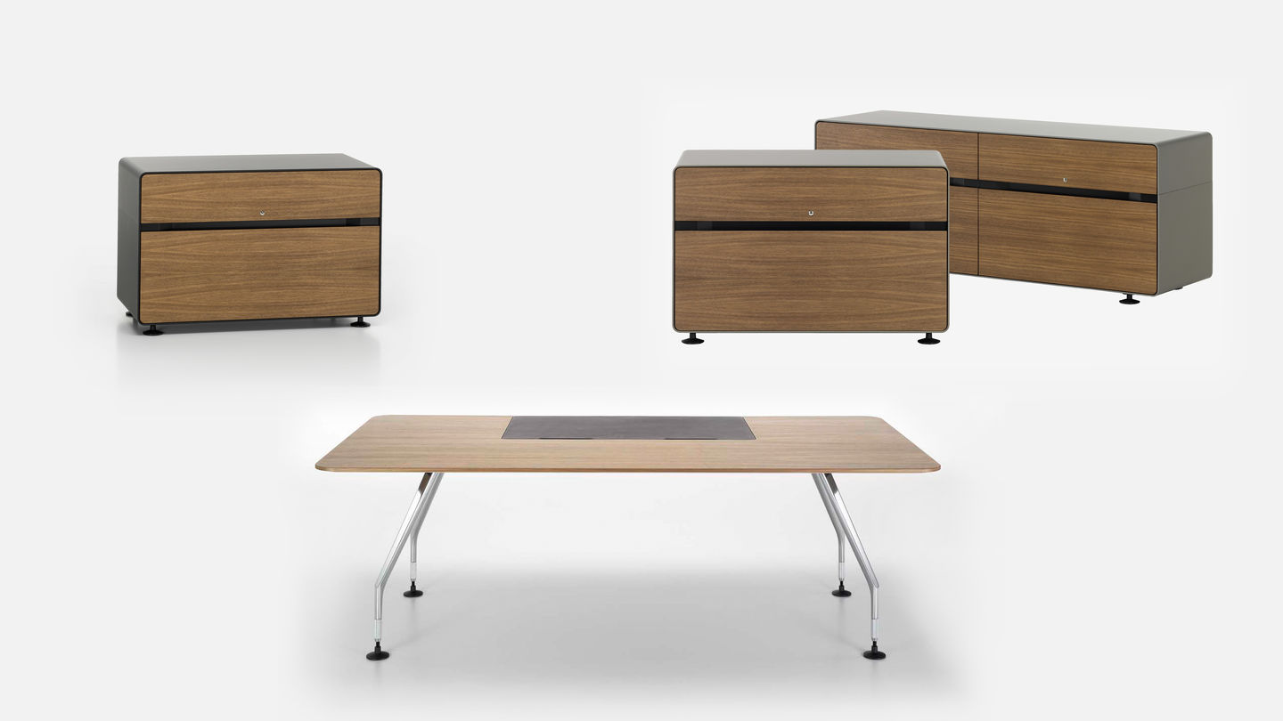 行政办公室计划包括一张大桌子和三个不同的储物家具。 所使用的材料,如铝,木材和皮革,质量特别高,精心制作到最后的细节。 凭借其建设性的轻盈和设计优雅,该计划可以与Ad Hoc办公系统,AC 4椅子(均由Antonio Citterio设计)或Vitra系列经典系列完美结合。
