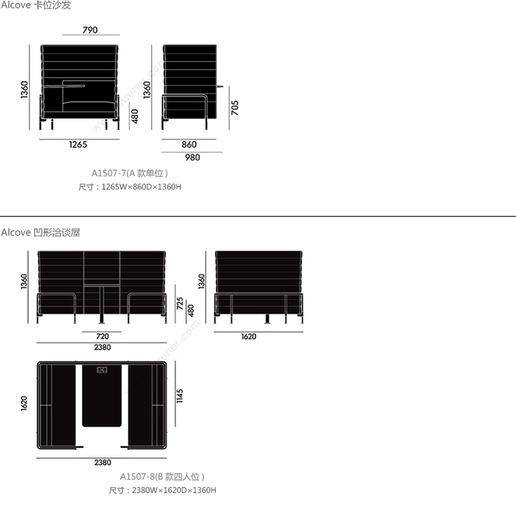 alcove 卡位沙发 系列尺寸/示意图