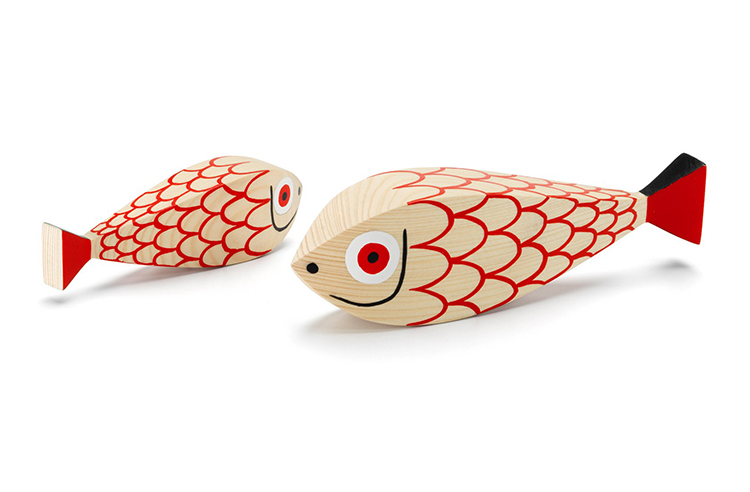 两条鱼 - 一位母亲和她的小母狗 - 将动物世界的另一个主题添加到亚历山大吉拉德的木制娃娃的欢乐家庭中。 它们的水平方向使它们与大型娃娃系列中其他人物的站姿相区别。