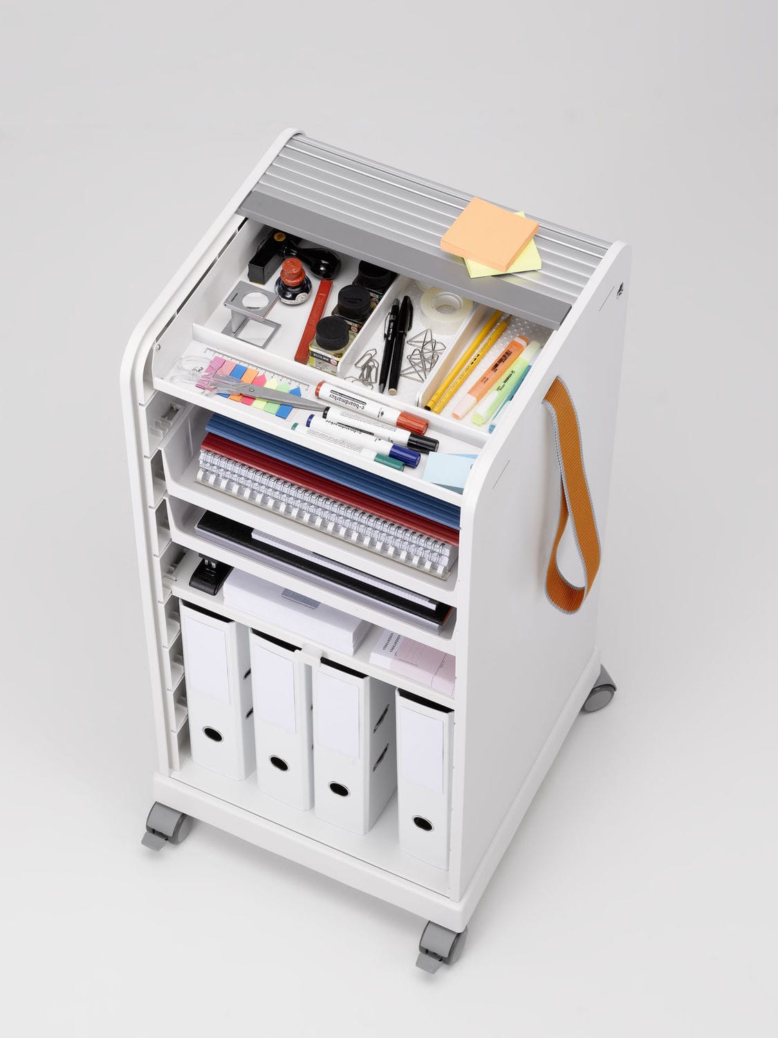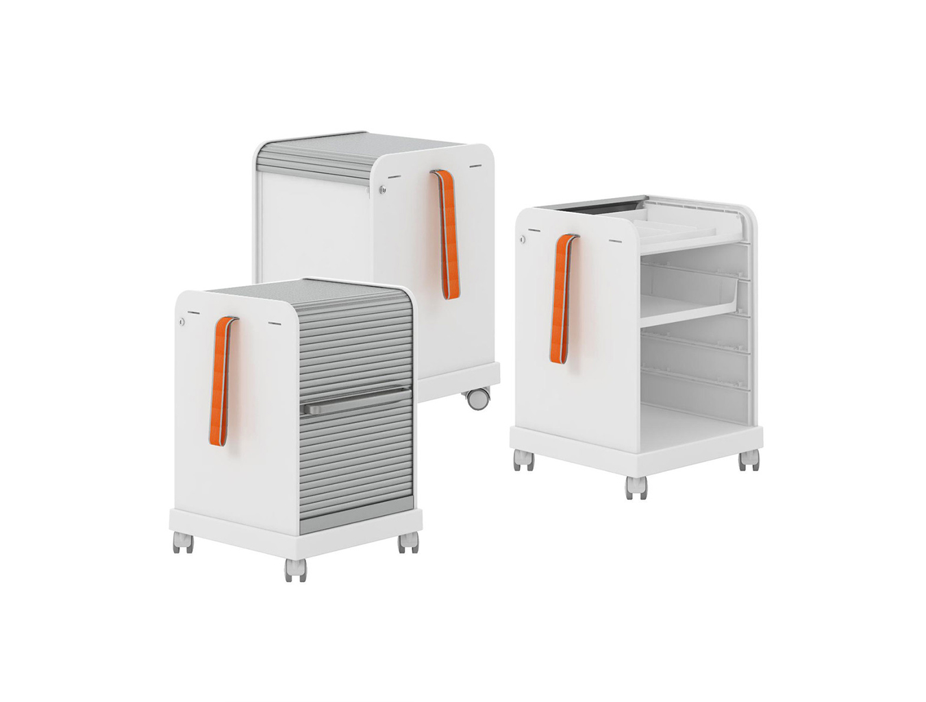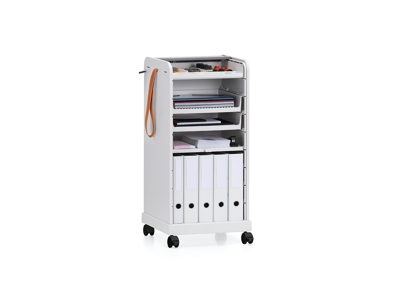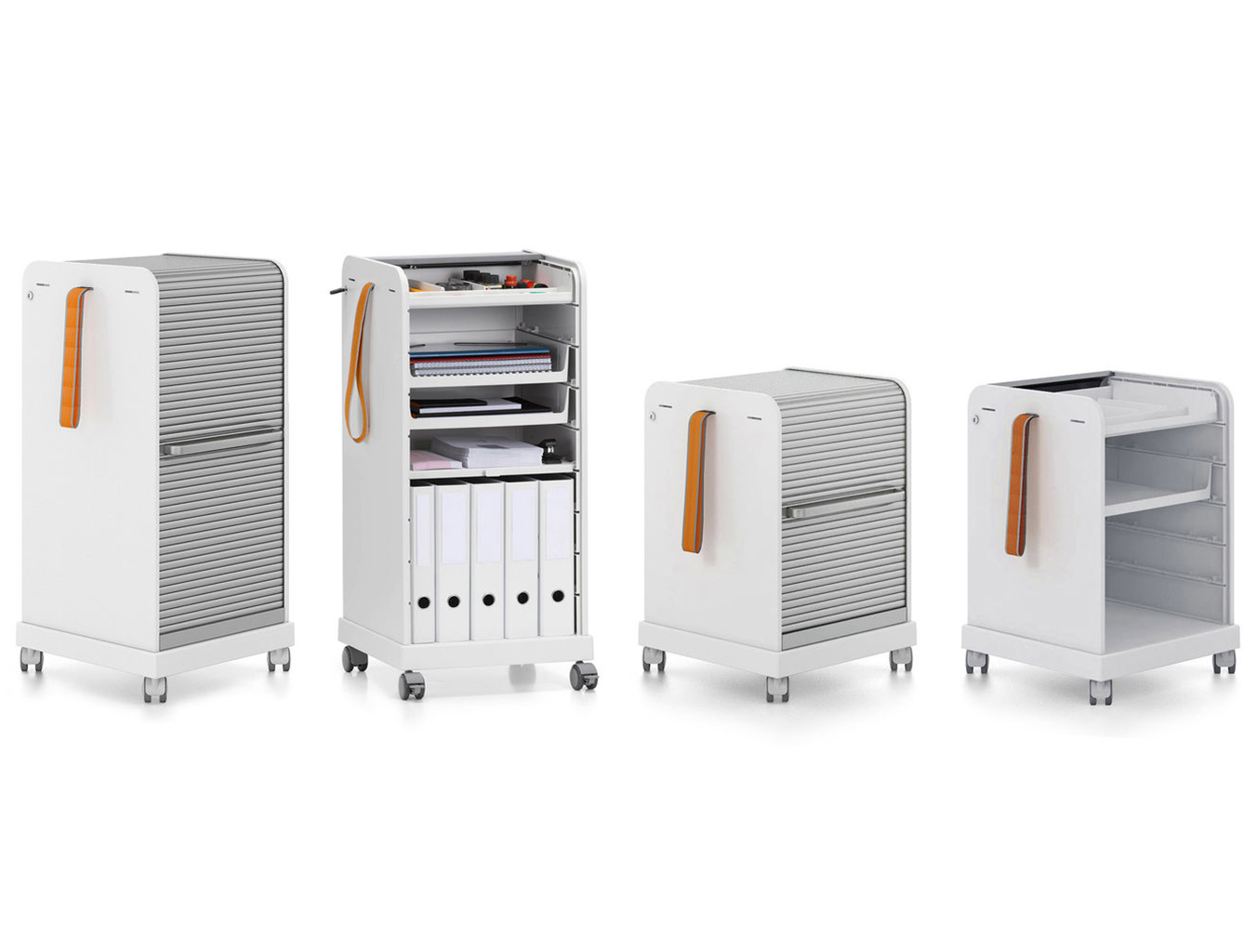 跟随我1和2是坚固,可锁定的移动基座,用于办公室和家庭。 装饰性拉带可以轻松地将手推车从一个地方移动到另一个地方。 一个(跟随我1)或两个(跟随我2)用于活页夹的货架空间和一个带有可移动托盘的集成存储隔间用于纸张和个人物品可以隐藏在移动基座的鼓形快门后面。 两种型号都可以单独配置可选的抽屉和搁板。 较高的Follow Me 2版本是站立高度表的理想伴侣。