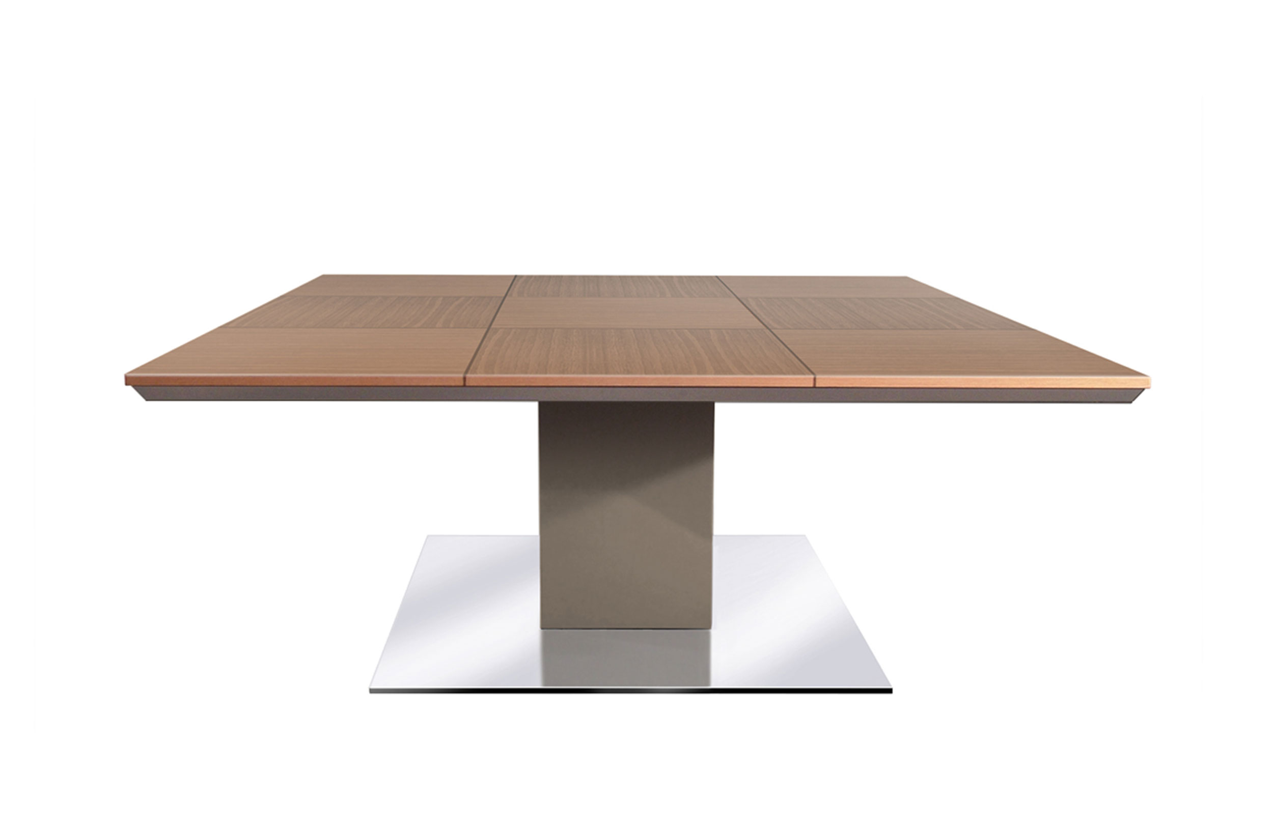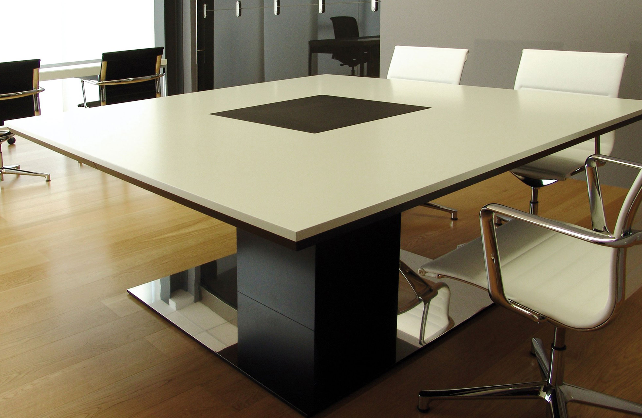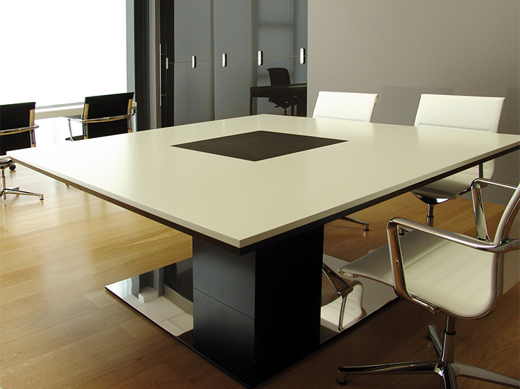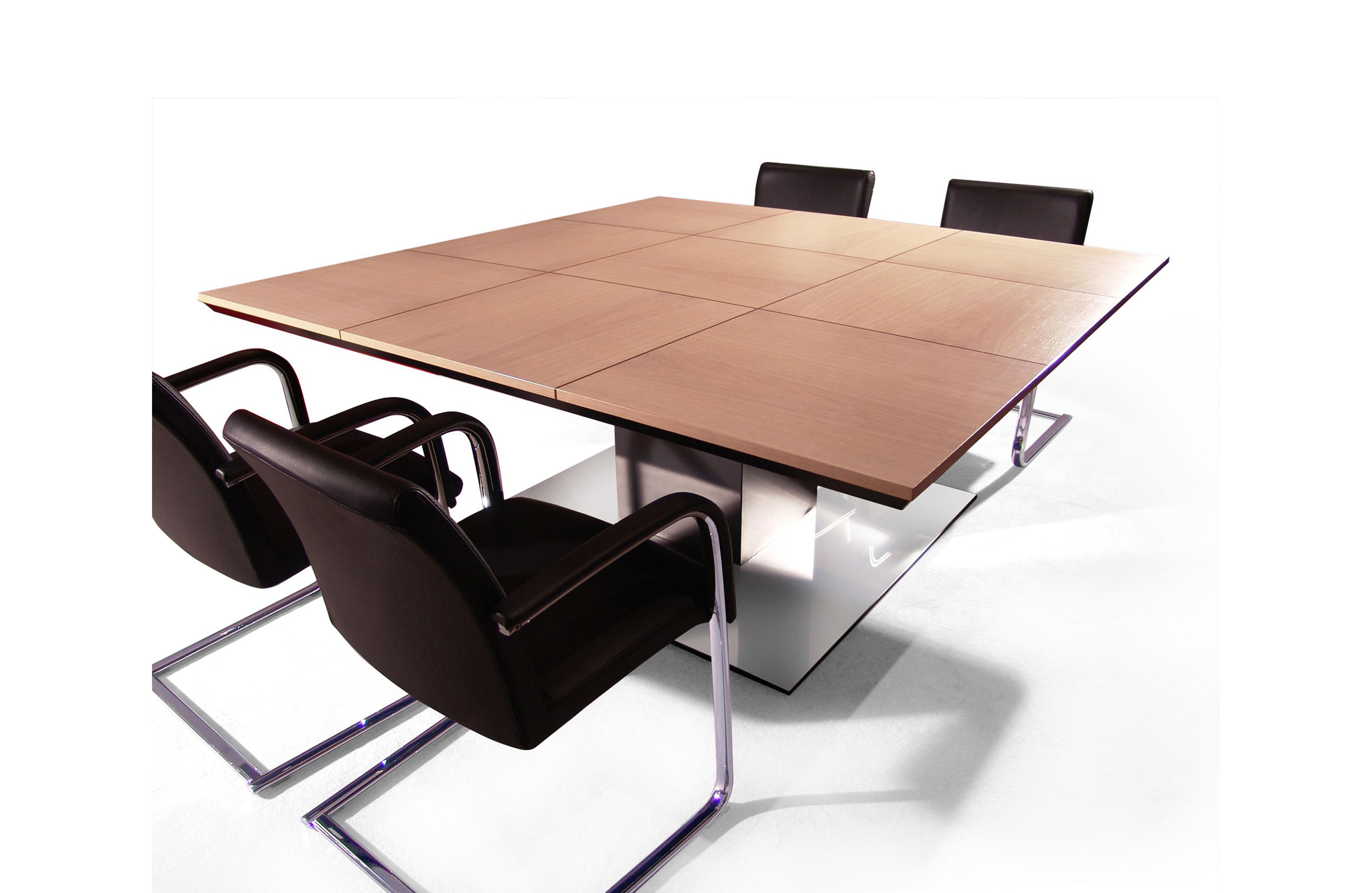 会议桌。顶部饰有镶嵌工艺的几何图案,与木纹的方向一致,并由顶部镶嵌的微妙轮廓框起。中央支脚由一个方形金属柱固定在镀有抛光不锈钢的铝制底座上。表面处理:顶部镶嵌两种不同木材的镶嵌工艺。微纹理漆中的平方柱。亚光不锈钢底板。