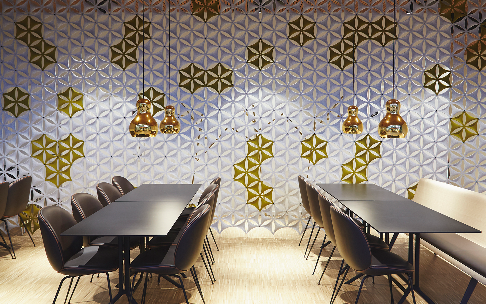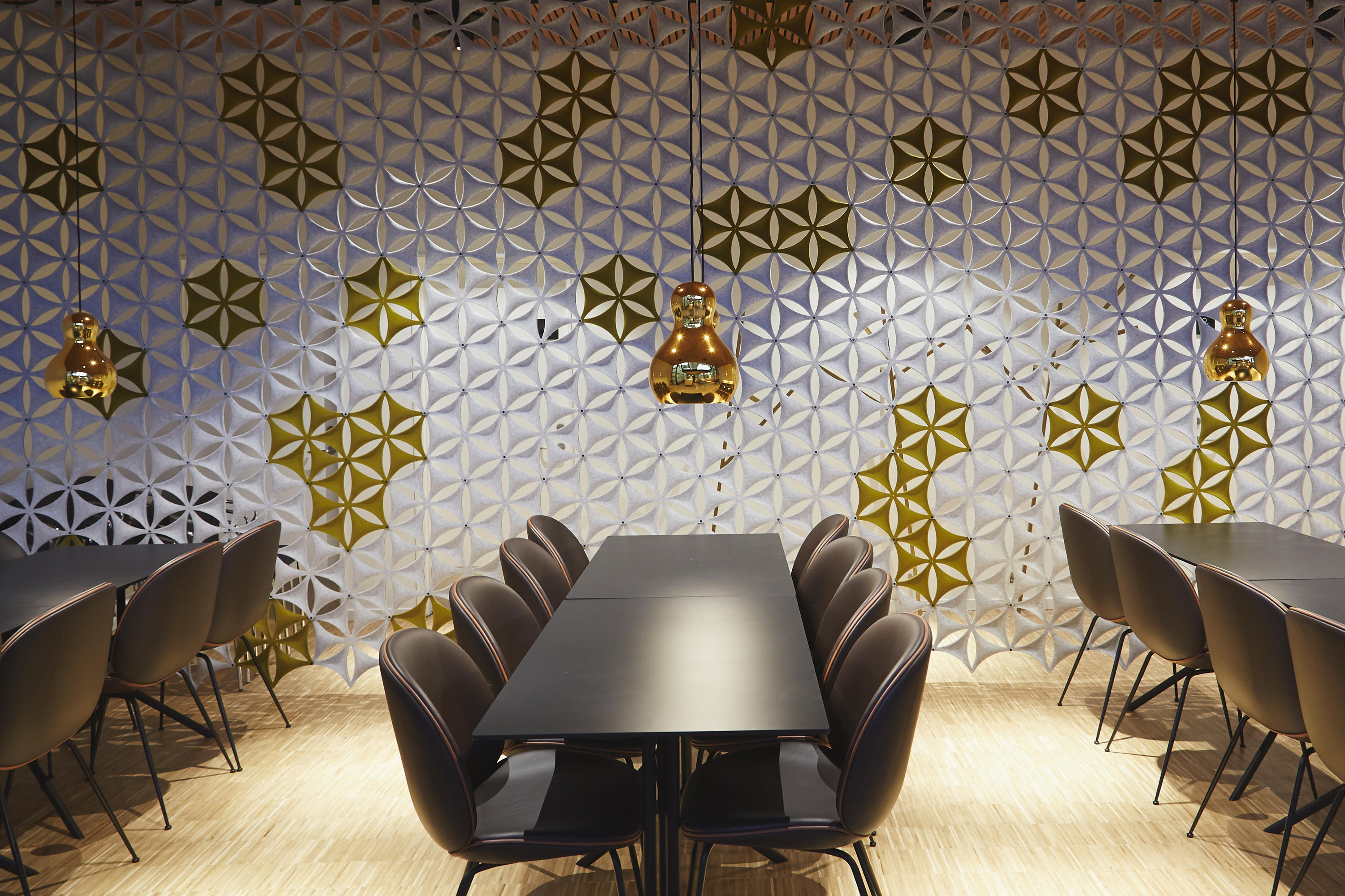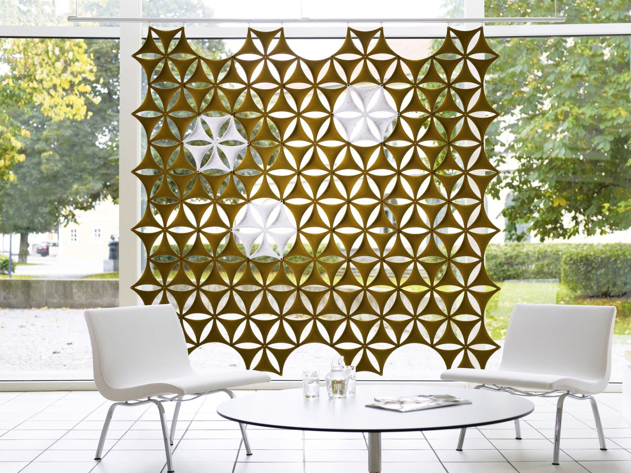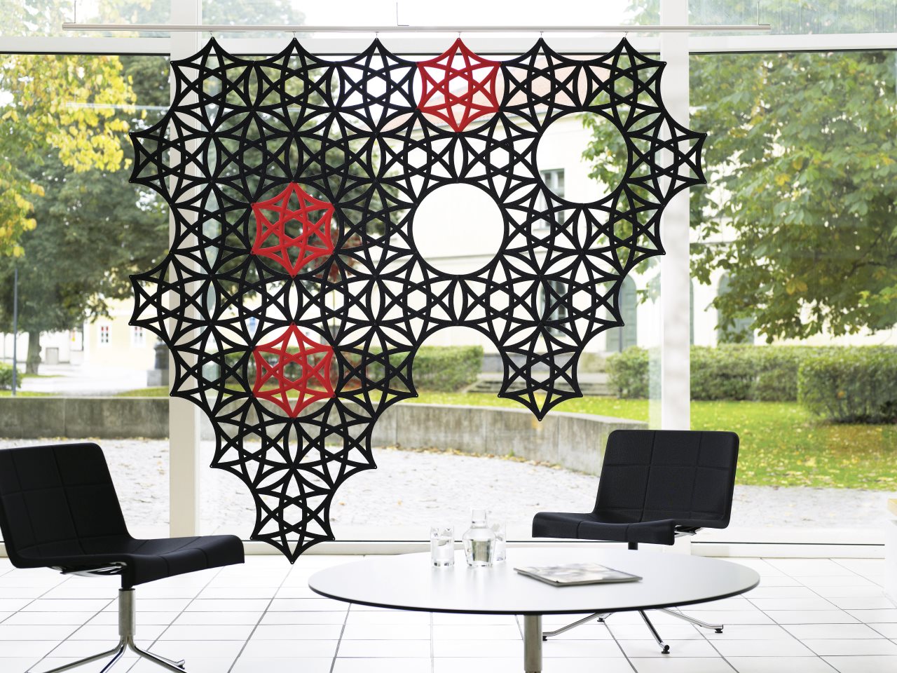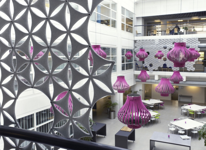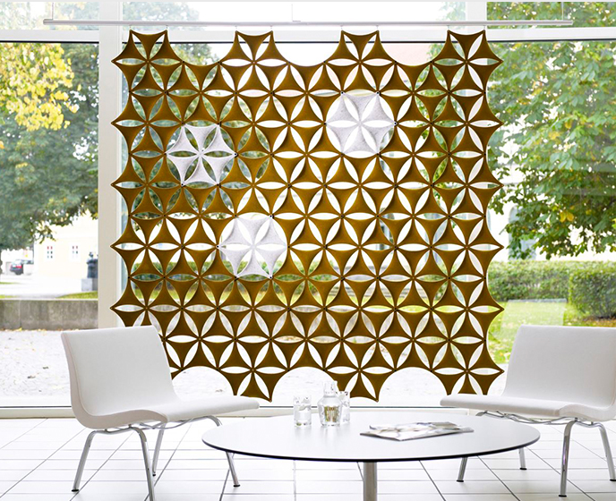 Aiflake / Airflake XL是一种基于六边形的模块化系统,可以自由组合以形成悬挂式隔断。Airflake散发出令人不快的声音反射,非常适合拥有大型开放区域的房间。Airflake由模制纤维毡制成。模块可以与塑料夹连接以产生不同类型的图案形成。使用直的或弯曲的白色或银色阳极氧化铝导轨,电线或假天花板固定在天花板或墙壁上