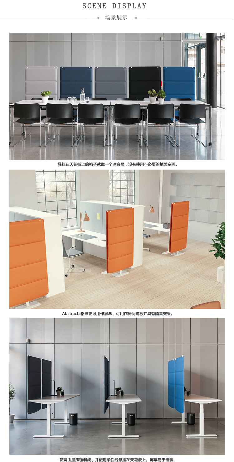Abstracta格子图案更新了隔断墙的概念,同时保留了传统消音器的特性和功能。由层压毡和织物制成,您可以悬挂或离开柔软的格子板; 一切都取决于空间的需求。Abstracta格子系列包括地板屏幕,挂板和房屋。由层压毡和织物制成,您可以根据房间的需要将柔软的格子板挂在天花板上或站在地板上。