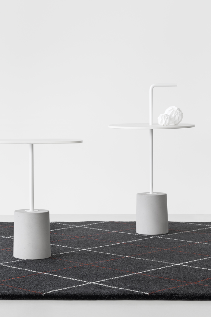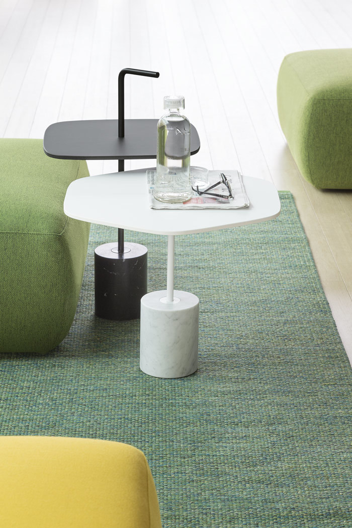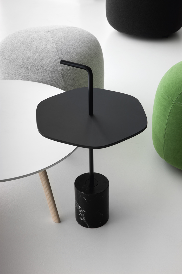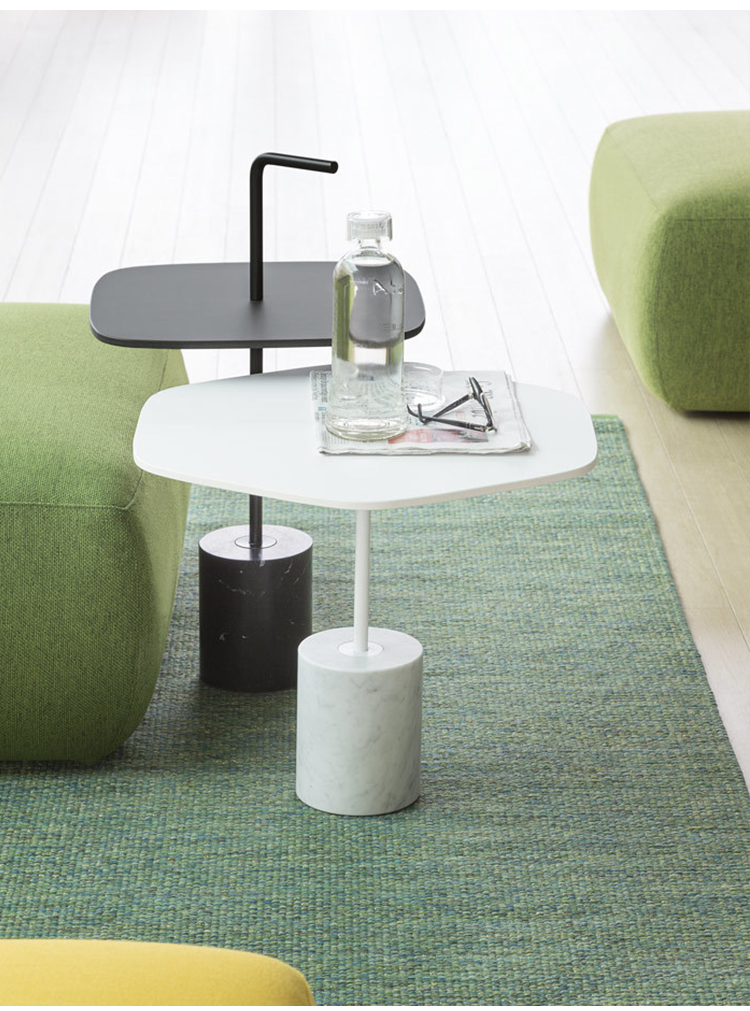 JEY.稳定且可移动。它可以作为一个顶部或便携式的桌子。它有两种不同的高度(45和50厘米)和四种不同的顶部,两种材料和两种颜色。它是一种小型的桌子雕塑,有大理石或水泥底座,管状柱以各种几何图形发展成一个形状的顶部,以一个手柄结束。手柄形状的弯管可以方便地移动桌子,特别是在高频区域(如办公室、酒店、酒吧、餐馆等),但也适用于当代居住环境。它可以与扶手椅、沙发、另一张桌子或另一张Jey相匹配。