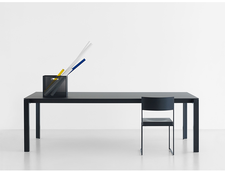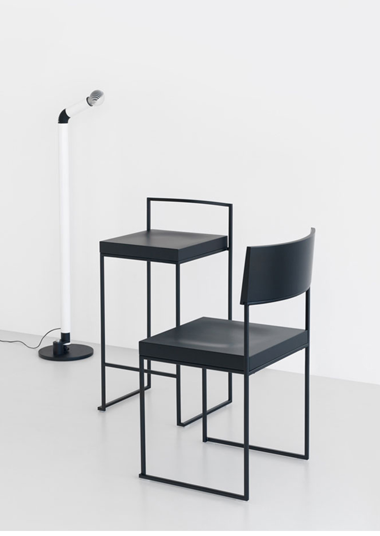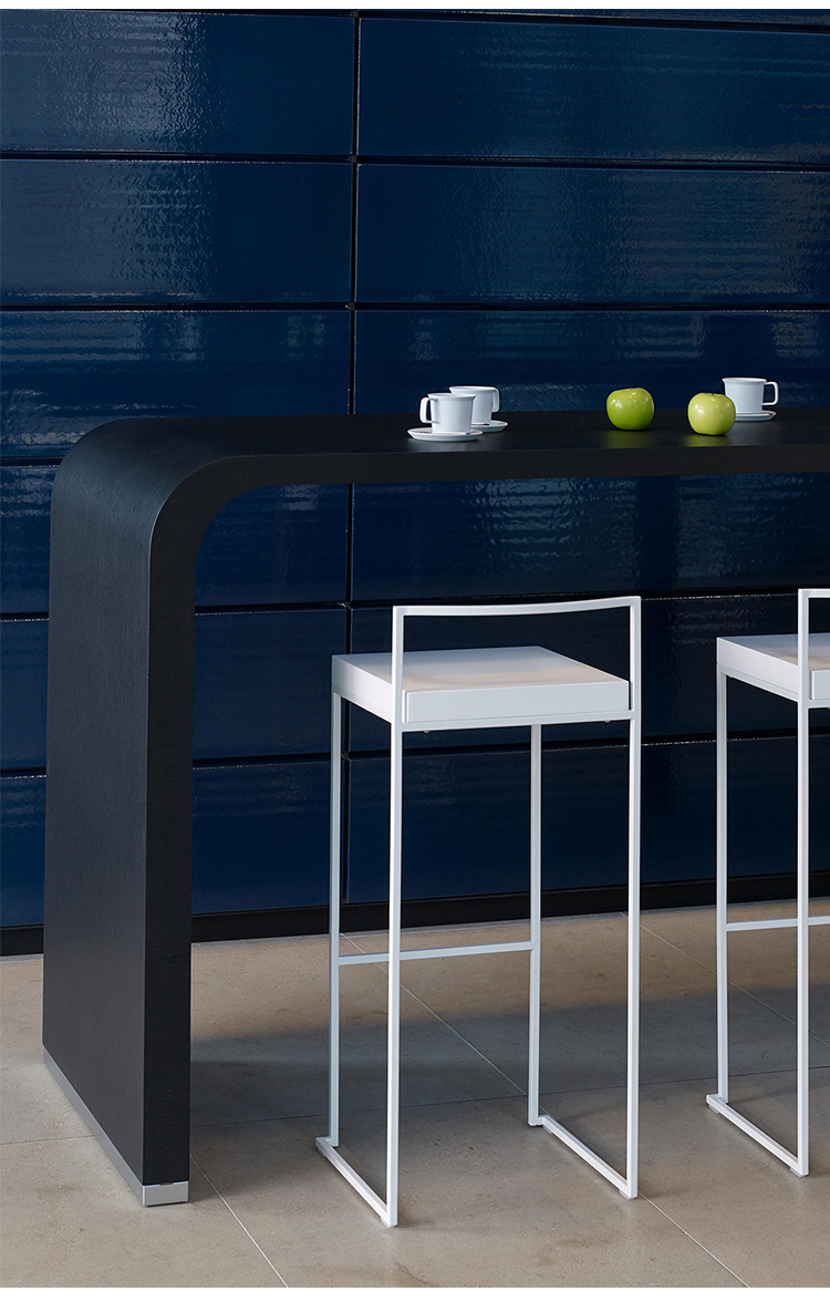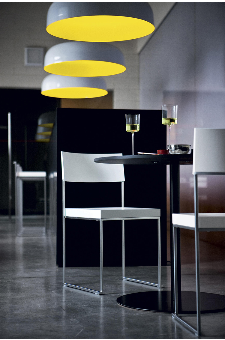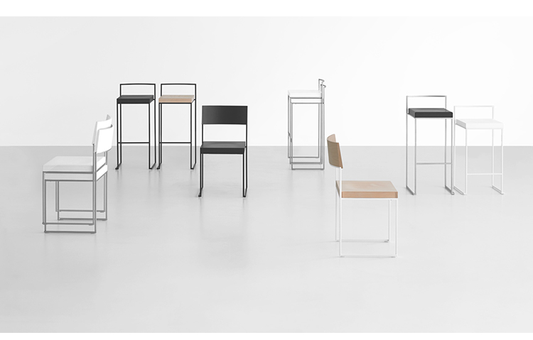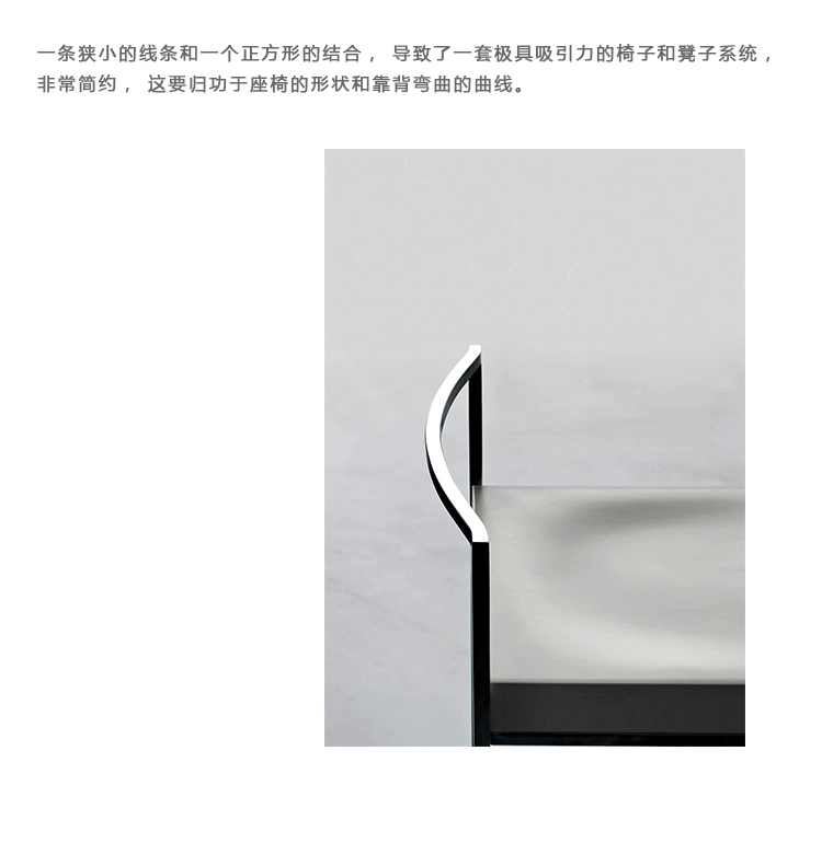 一条狭小的线条和一个正方形的结合,导致了一套极具吸引力的椅子和凳子系统,非常简约,这要归功于座椅的形状和靠背弯曲的曲线。