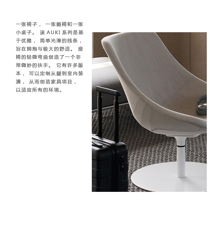 一张椅子,一张躺椅和一张小桌子。该AUKI系列是基于优雅,简单光滑的线条,旨在拥抱与极大的舒适。座椅的轻微弯曲创造了一个非常微妙的扶手。它有许多版本,可以定制从腿到室内装潢,从而创造家具项目,以适应所有的环境。