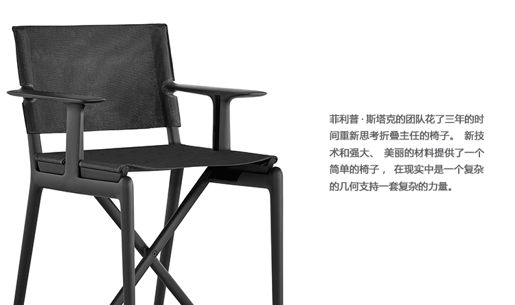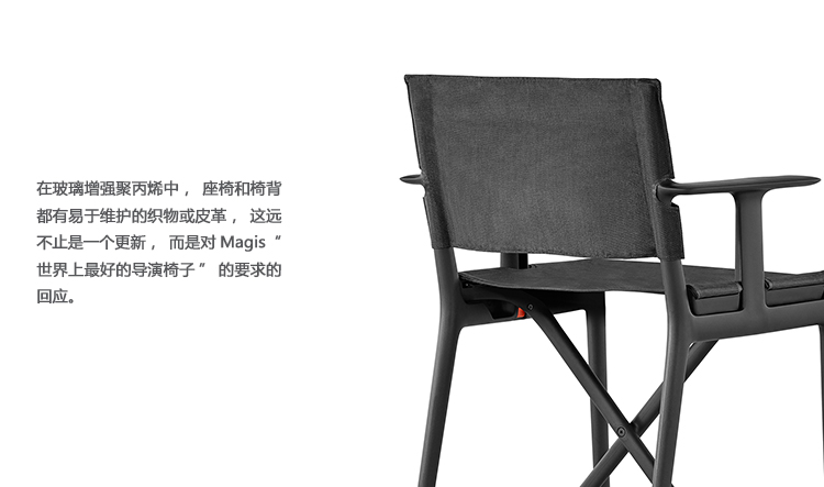 菲利普·斯塔克的团队花了三年的时间重新思考折叠主任的椅子。新技术和强大、美丽的材料提供了一个简单的椅子,在现实中是一个复杂的几何支持一套复杂的力量。结果,在玻璃增强聚丙烯中,座椅和椅背都有易于维护的织物或皮革,这远不止是一个更新,而是对Magis“世界上最好的导演椅子”的要求的回应。
