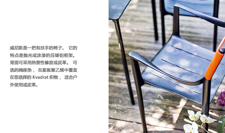 威尼斯是一把有扶手的椅子。它的特点是抛光或涂漆的压铸铝框架。背面可采用热塑性橡胶或皮革。可选择的座位垫在膨胀聚乙烯覆盖在您选择的Kvadrat织物,适合户外使用或皮革。