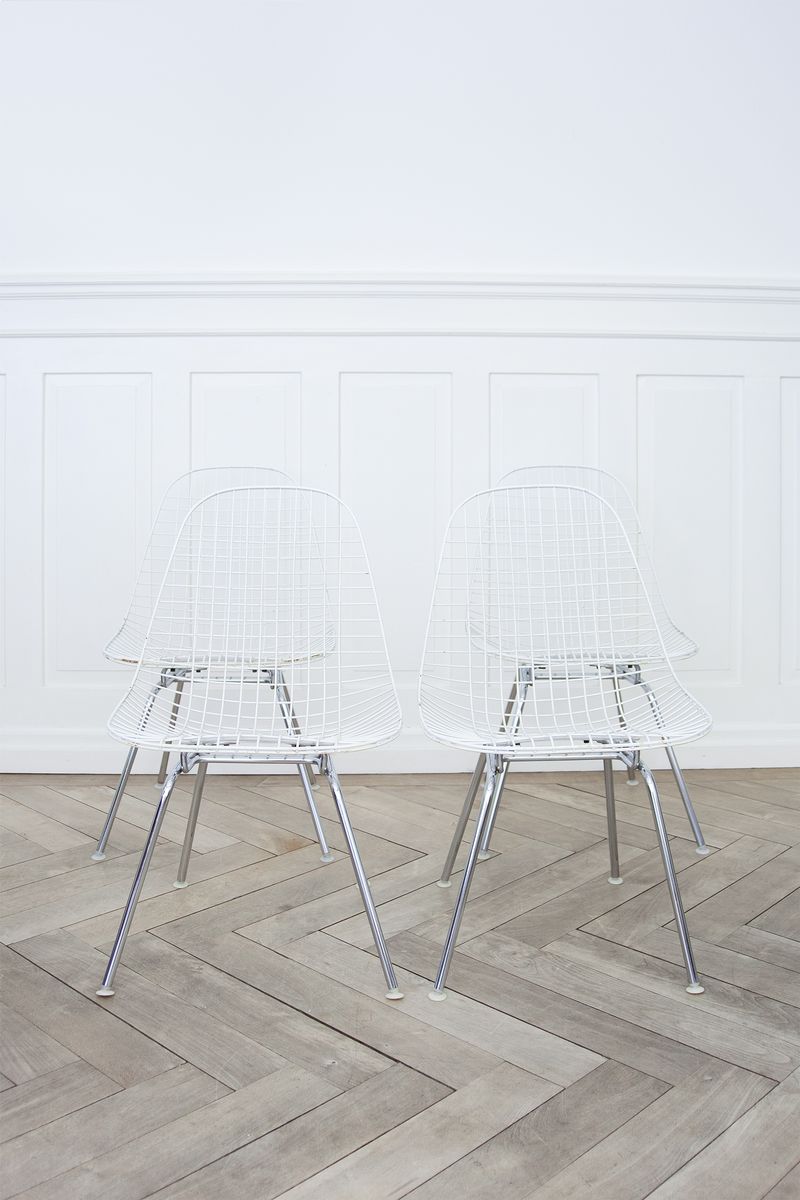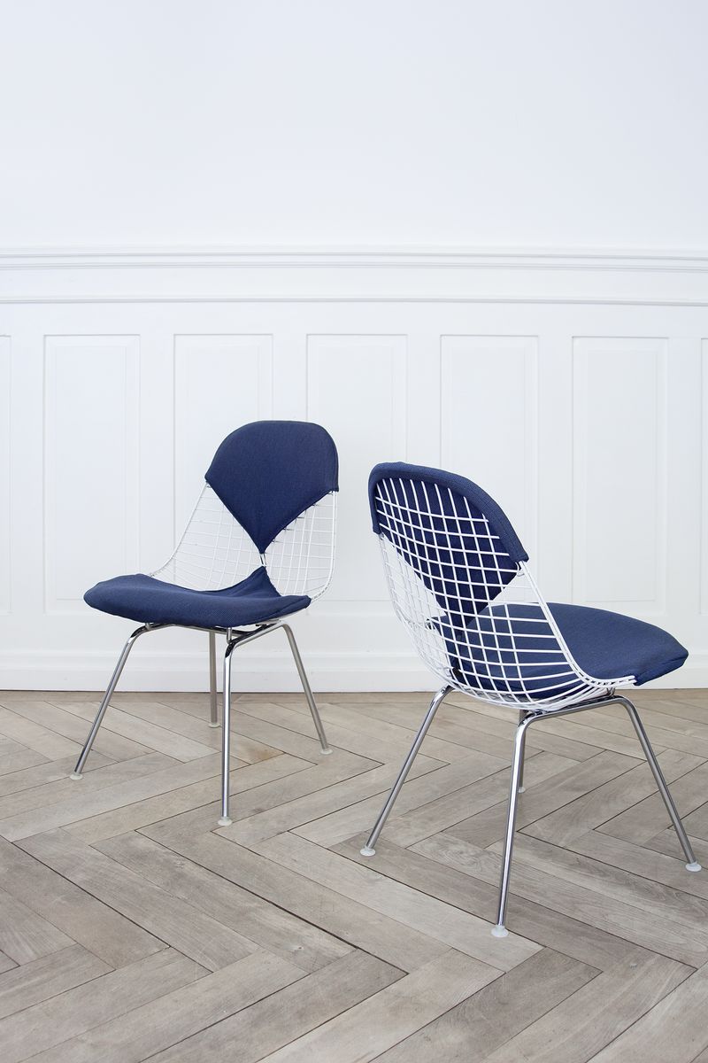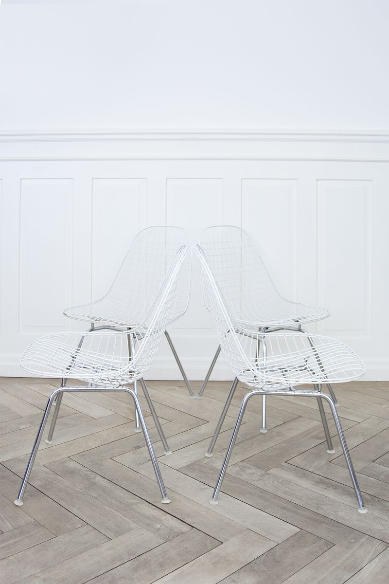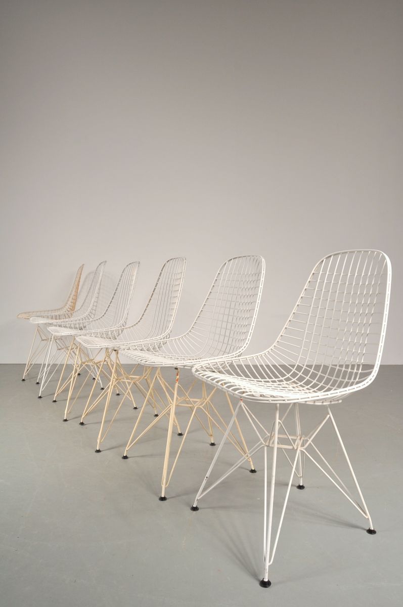 Charles & Ray Eames 1951 年發表的 Wire Chair 系列,以一片式有機網狀椅座,延伸變化出一系列不同椅腳及座墊搭配的單椅,這系列椅款輕巧透明的設計,在 60 年代可說是運用了當時最先進的技術來製作,靈感則是來自於鏤空的金屬收納籃,金屬條交織的椅座,彎曲的弧面不僅符合人體工學,在視覺上更具有穿透性。