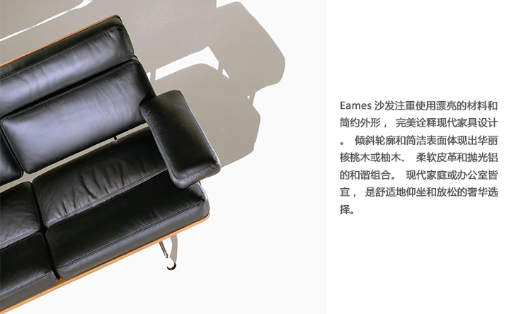Eames沙发注重使用漂亮的材料和简约外形,完美诠释现代家具设计。倾斜轮廓和简洁表面体现出华丽核桃木或柚木、柔软皮革和抛光铝的和谐组合。现代家庭或办公室皆宜,是舒适地仰坐和放松的奢华选择。