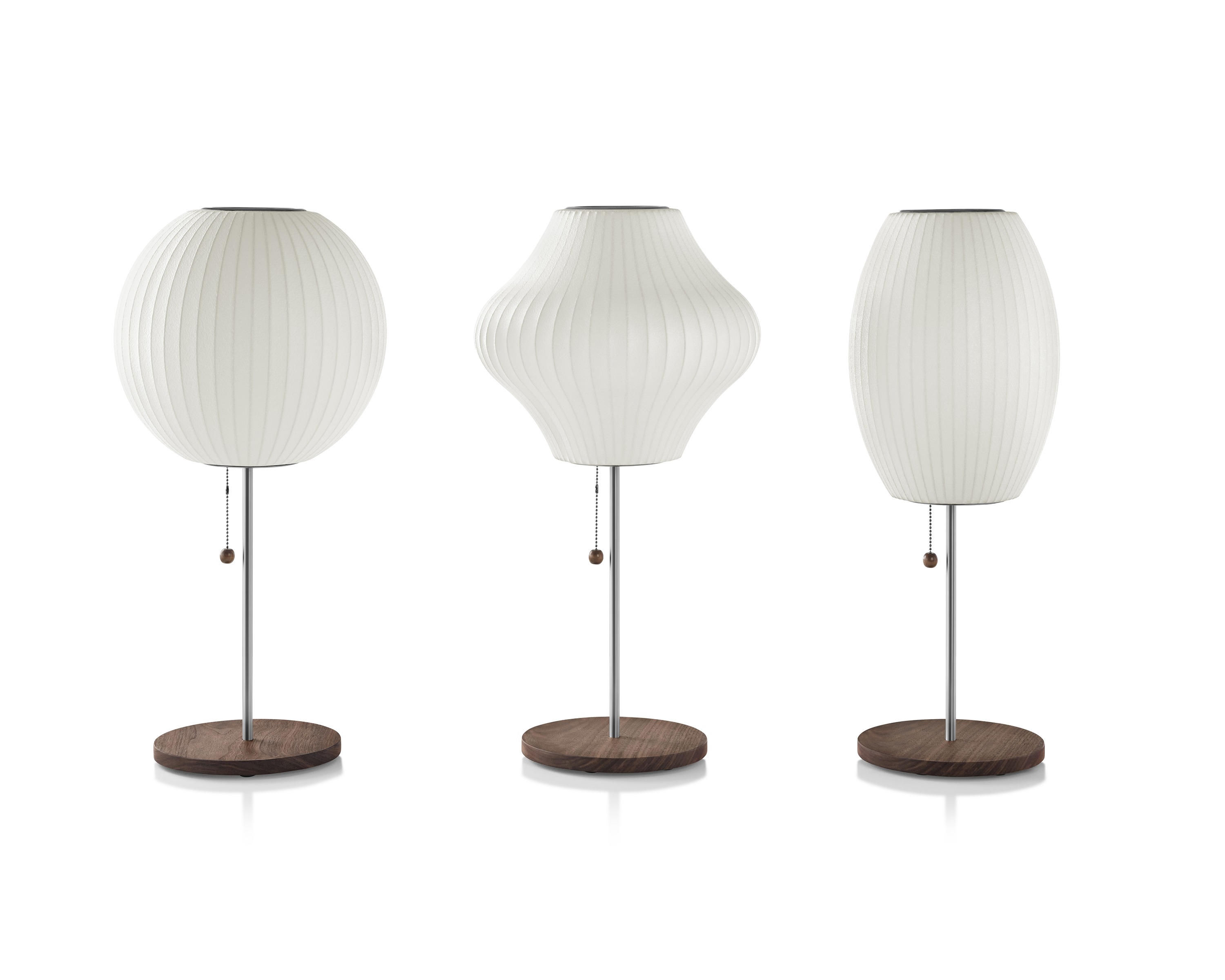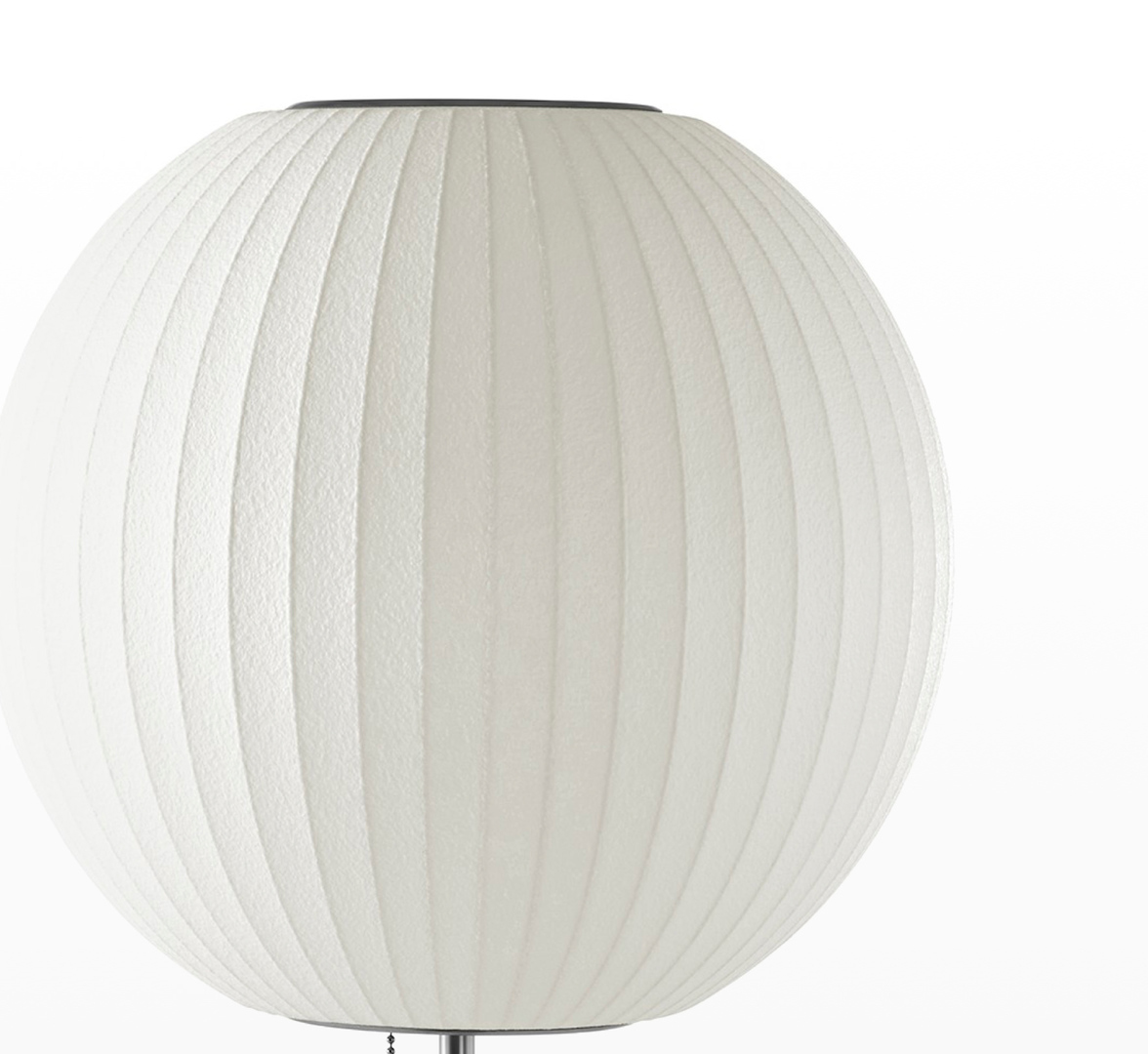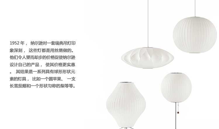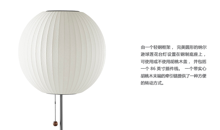 Nelson Ball莲花台灯采用轻质钢框架制成,完美圆润的球形底座设置在钢制底座上,有或没有胡桃木盖,并配有86英寸插入式线。 带有实心胡桃木末端的拉链提供了打开和关闭灯泡的便捷方式。 1952年,尼尔森对一套瑞典吊灯印象深刻,这些吊灯采用丝绸覆盖物制成。 他们高昂的价格促使尼尔森以一种让他们更实惠的方式设计自己的价格。 结果是一系列具有元素,球形形状的灯,如圆形苹果,细长雪茄和形状梨等。