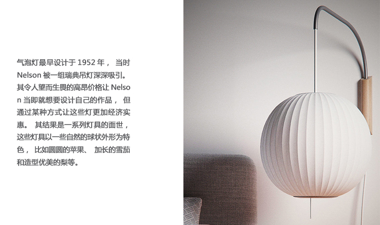泡泡灯系列基本上是球形的变化,是一种杰出而永恒的乔治尼尔森设计。 Nelson Ball Wall Sconce采用旋转铰链和可调节插入式线缆设计,可轻松移动灯罩,无需在墙壁上重新调整。 1952年,一套瑞典吊灯被引入美国市场,乔治·尼尔森给人留下了深刻的印象,想要办公室。 他们昂贵的价格使他无法购买,但也激发了他设计自己的价格。 结果是一系列具有元素,球形形状的灯,如圆形苹果,细长雪茄和形状梨等。