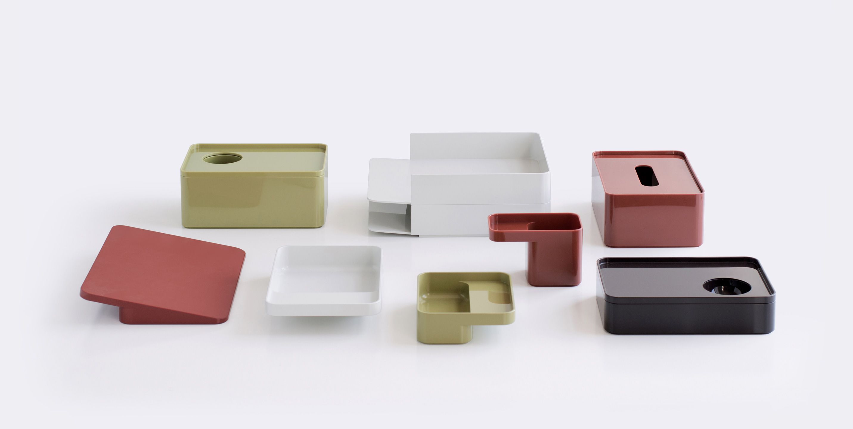 考虑到占据家庭及办公室空间的笨重物品的存放问题,Sam Hecht和Kim Colin设计了具有可拆卸盖子的储物盒。每个盖子上设计有孔洞,可供放置移动式笔筒。或者,笔筒可固定于储物盒内部孔洞下方压槽中,从而在无需打开盖子的情况下便可接触杯中物品。