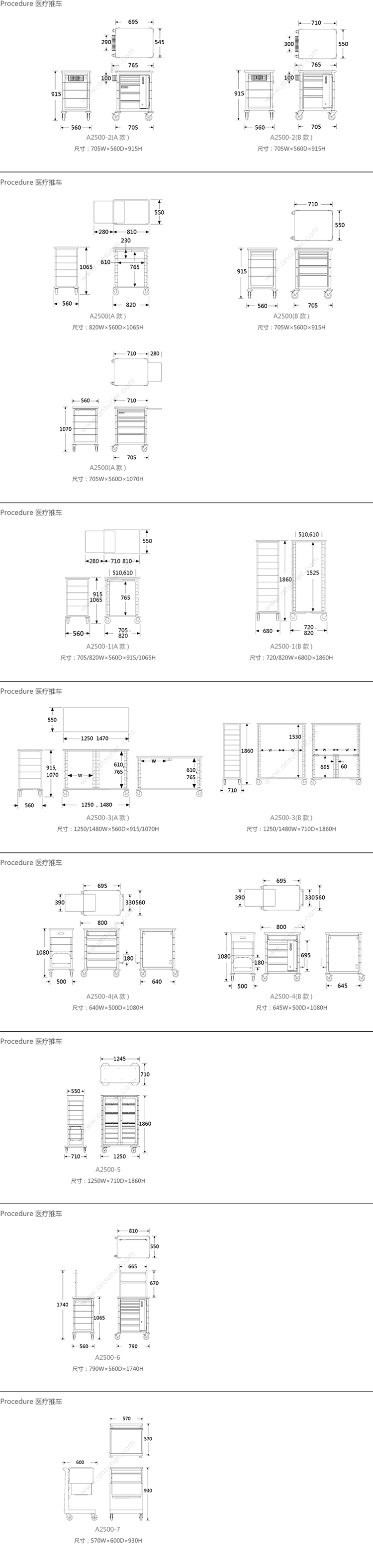 Procedure 医疗推车 系列尺寸/示意图