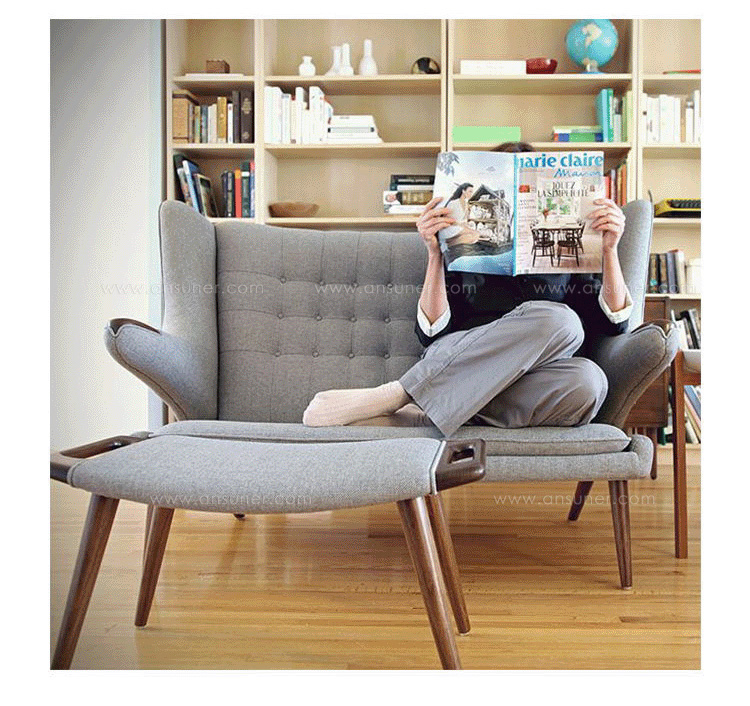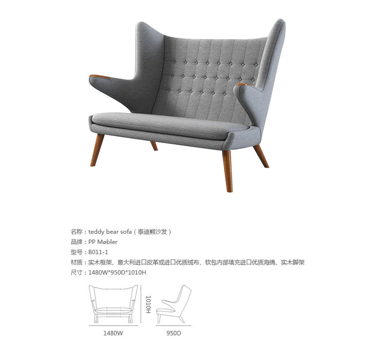 Teddy Bear Sofa(泰迪熊沙发)是丹麦设计大师 Hans J. Wegner泰迪熊椅的加长版,其构造和功能都和泰迪熊椅一致。其和泰迪椅子一直是最流行的韦格纳设计之一。泰迪熊沙发全程手工制作,是定制家具中的高档产品,人工缝线更加细腻。立体剪裁让椅子更具形态美。远远望去就像一种张开怀抱的母熊,特别有爱。椅子脚采用水曲木和核桃木,表面100%的真皮或是羊绒布,高档的材质配合精妙的设计,让人眼前一亮。椅子脚采用水曲木和核桃木,表面100%的真皮或是羊绒布,高档的材质配合精妙的设计,让人眼前一亮。