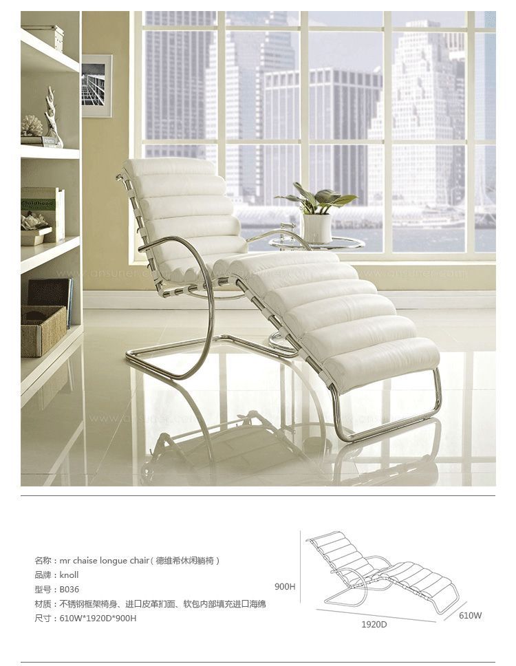 密斯躺椅(MR Adjustable Chaise Lounge)是由密斯·凡·德罗设计的,并由雅帝生产制造,我们是专业生产各种欧洲现代经典家具的公司,所以非常注重设计、质量和原版的一致性,所以我们成产出来的MR Adjustable Chaise Lounge外形独特,结构非常简单,弯曲的不锈钢架有点像布尔诺椅的设计思路,也正体现了德罗的“少即是多”的设计理念。休闲躺椅(MR Adjustable Chaise Lounge)以人体学为基础,设计出了符合人体架构的椅子,坐上去舒适,优雅大方。