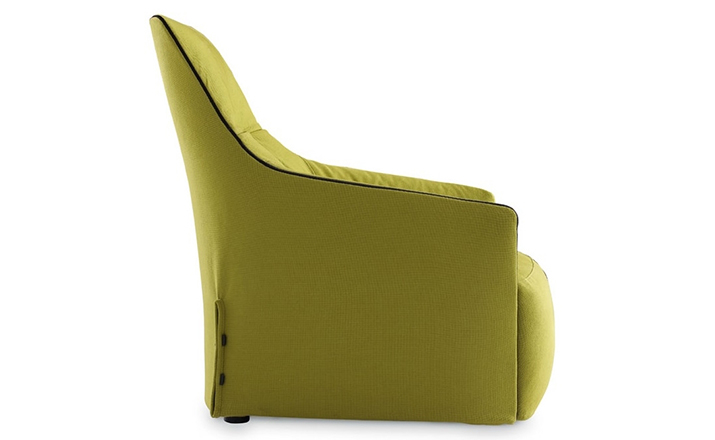 "The Santa Monica Lounge armchair,characterized by a unique design,is a project conceived by the French designer Jean-Marie Massaud,and it is produced by Poliform,a leading company in the made in Italy furniture manufacture.The Santa Monica Lounge armchair on sale in our showroom is matched with the Santa Monica ottoman.Both the items are covered in fabric,yellow colour,with iron coloured stitches."