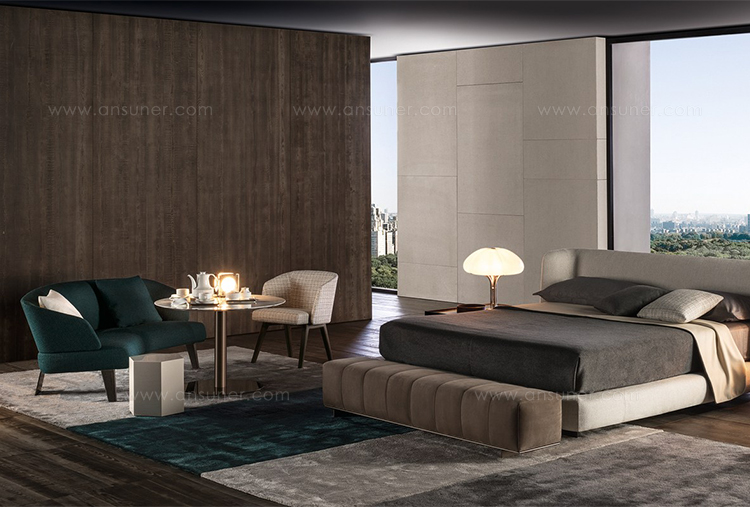 Creed “Lounge”沙发后方的地面支撑采用做工考究的弯曲金属架并搭配浅铜色亮光漆,前方支撑腿则为米灰色的鲍迪豆实木材质。支撑腿的上下方均采用精致的金属部件并搭配浅铜色亮面漆,用与众不同的细节设计来展现非同寻常的高超工艺。
