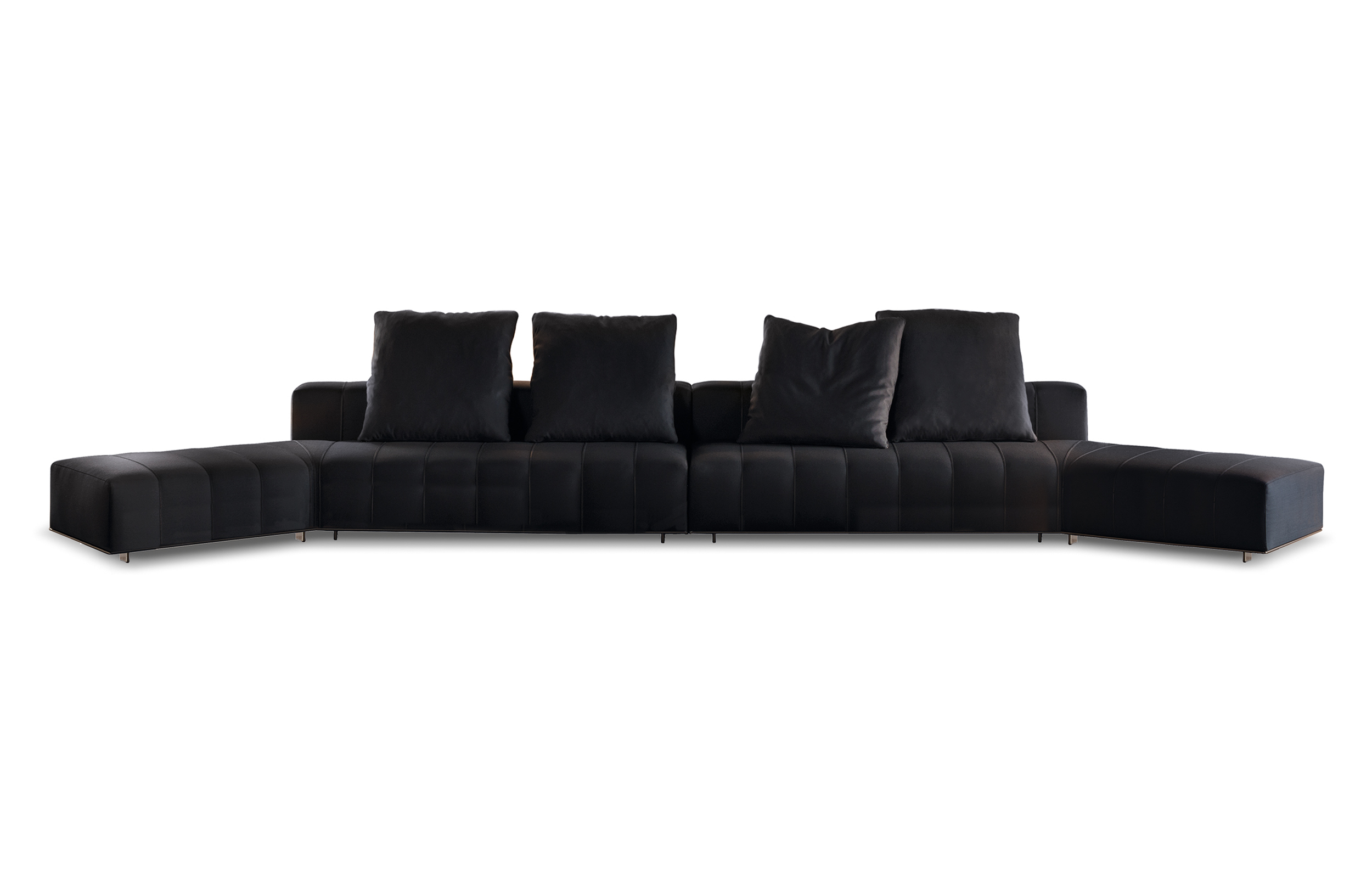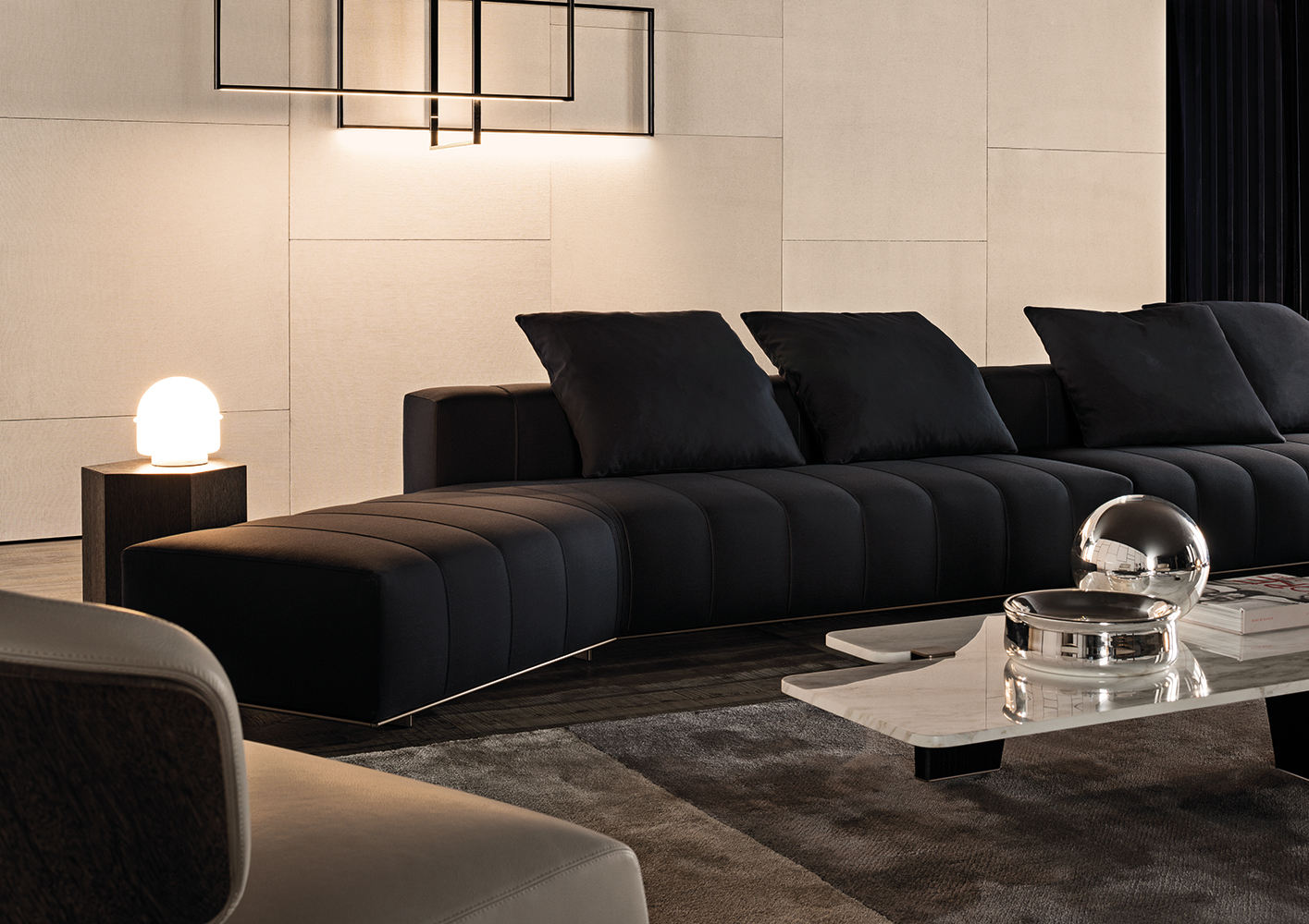 弗里曼“裁缝”项目的理念和原创性在其衍生系列弗里曼“休息室”中也有所体现。弗里曼“休息室”沙发纵深度有所降低,不仅更易搭配较小的居住空间,还可以用在接待场所,如等候室、前台区域、行政办公室。单组沙发的特点在于采用规则图形纹样的优雅缝线设计,可以自由随性地组合沙发,打造灵动的造型。“Wing”扶手拥有轻盈的线条,这要得益于采用聚氨酯为基材的泡沫金属框架。精致的包覆材料展现出公司运用复杂面料进行剪裁加工的实力。皮革和织物面料的各个部件通过浅铜色人造皮革束带和双缝线工艺连接在一起,打造出独特的纵深效果。