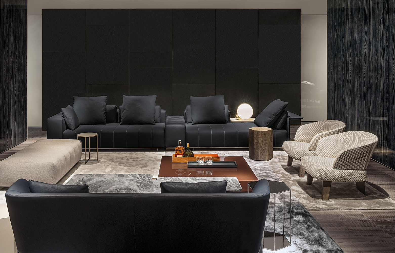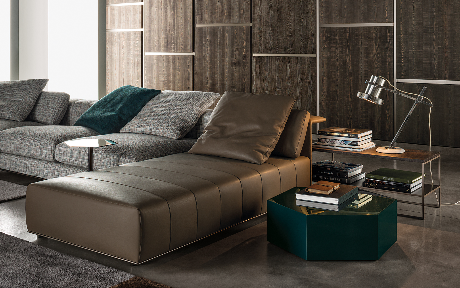 弗里曼“裁缝”项目的理念和原创性在其衍生系列弗里曼“休息室”中也有所体现。弗里曼“休息室”沙发纵深度有所降低,不仅更易搭配较小的居住空间,还可以用在接待场所,如等候室、前台区域、行政办公室。单组沙发的特点在于采用规则图形纹样的优雅缝线设计,可以自由随性地组合沙发,打造灵动的造型。“Wing”扶手拥有轻盈的线条,这要得益于采用聚氨酯为基材的泡沫金属框架。精致的包覆材料展现出公司运用复杂面料进行剪裁加工的实力。皮革和织物面料的各个部件通过浅铜色人造皮革束带和双缝线工艺连接在一起,打造出独特的纵深效果。