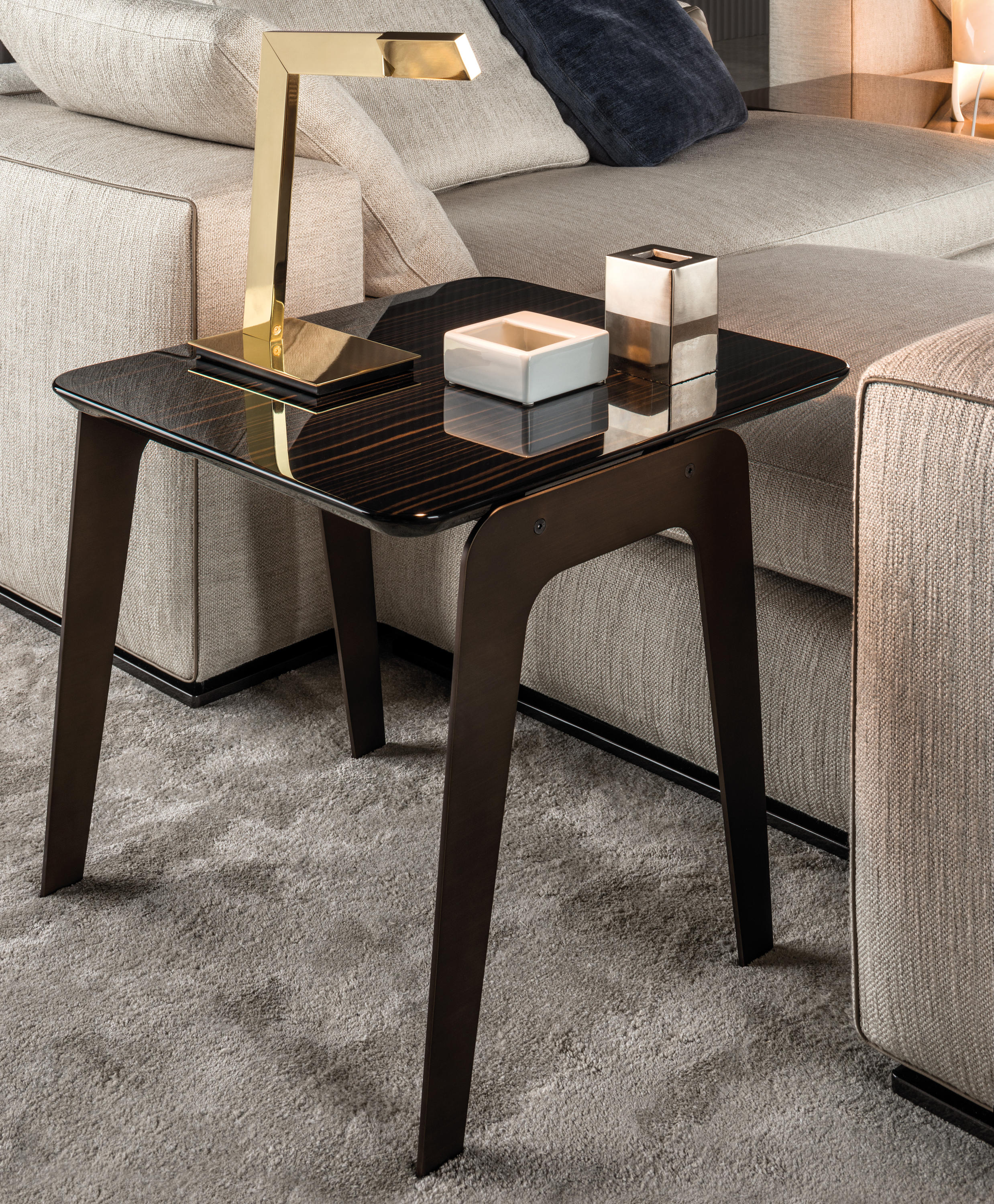 以精美梣木底座致敬传统黑檀木艺术,搭配拥有圆滑转角与柔和饰边的光泽漆面黑檀木、黑色脱蜡琉璃及 Marron Damasco 大理石台板。