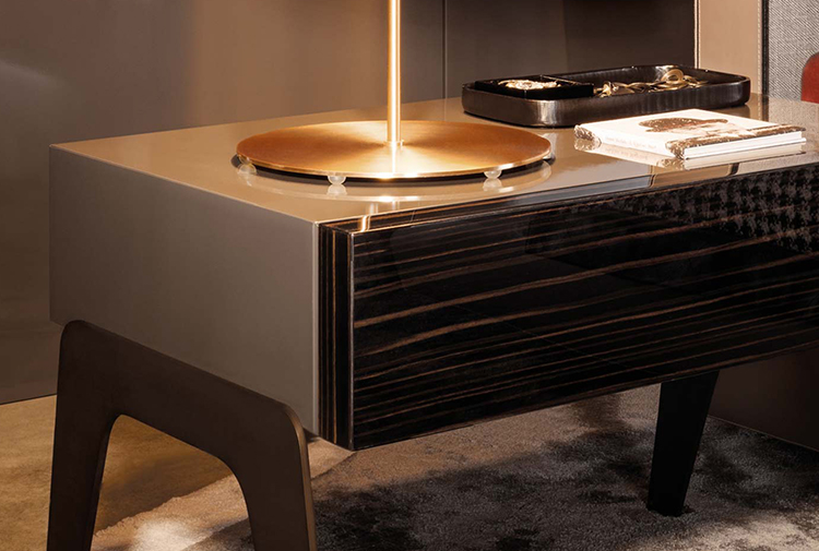 以精美梣木底座致敬传统黑檀木艺术,搭配拥有圆滑转角与柔和饰边的光泽漆面黑檀木、黑色脱蜡琉璃及 Marron Damasco 大理石台板。