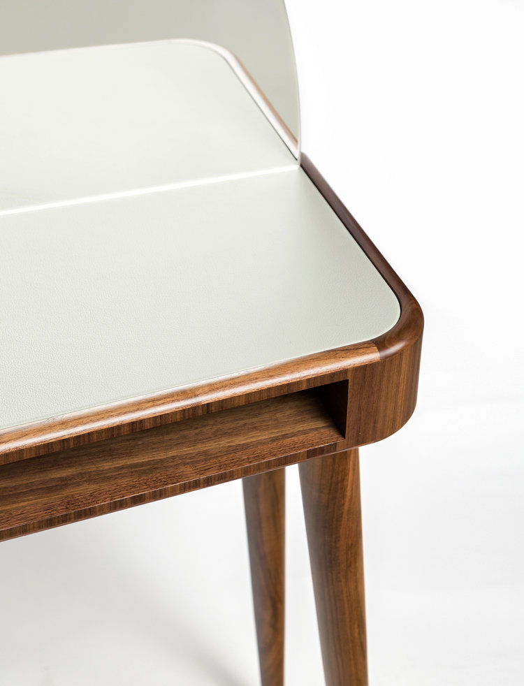这张工作/化妆台左边有一个抽屉,右边有一个小壁龛,用来存放你的物品。表面皮革和黄铜是可定制的。