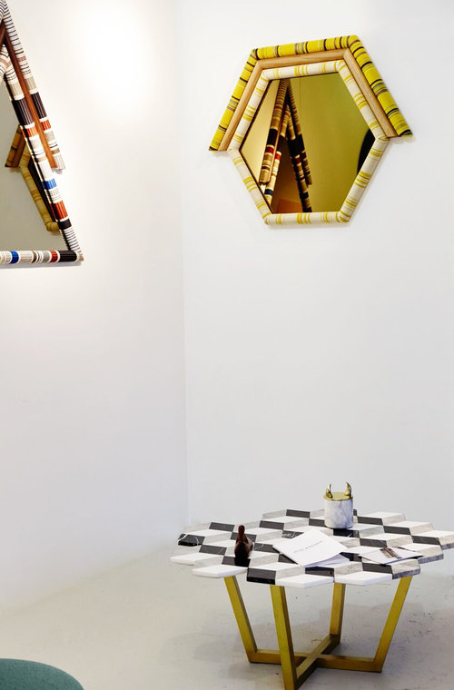 Pontiac(庞蒂亚克)镜受到美国印第安部落的启发。第一个版本有一个更男性化的基调,简单和强烈颜色和深色的木头结合了三角形的形状和灰色的镜子。保罗·史密斯设计的Kvadrat面料已被裁剪对称和手工制作的木材和泡沫。当地的印花和颜色组合与美国胡桃木相匹配