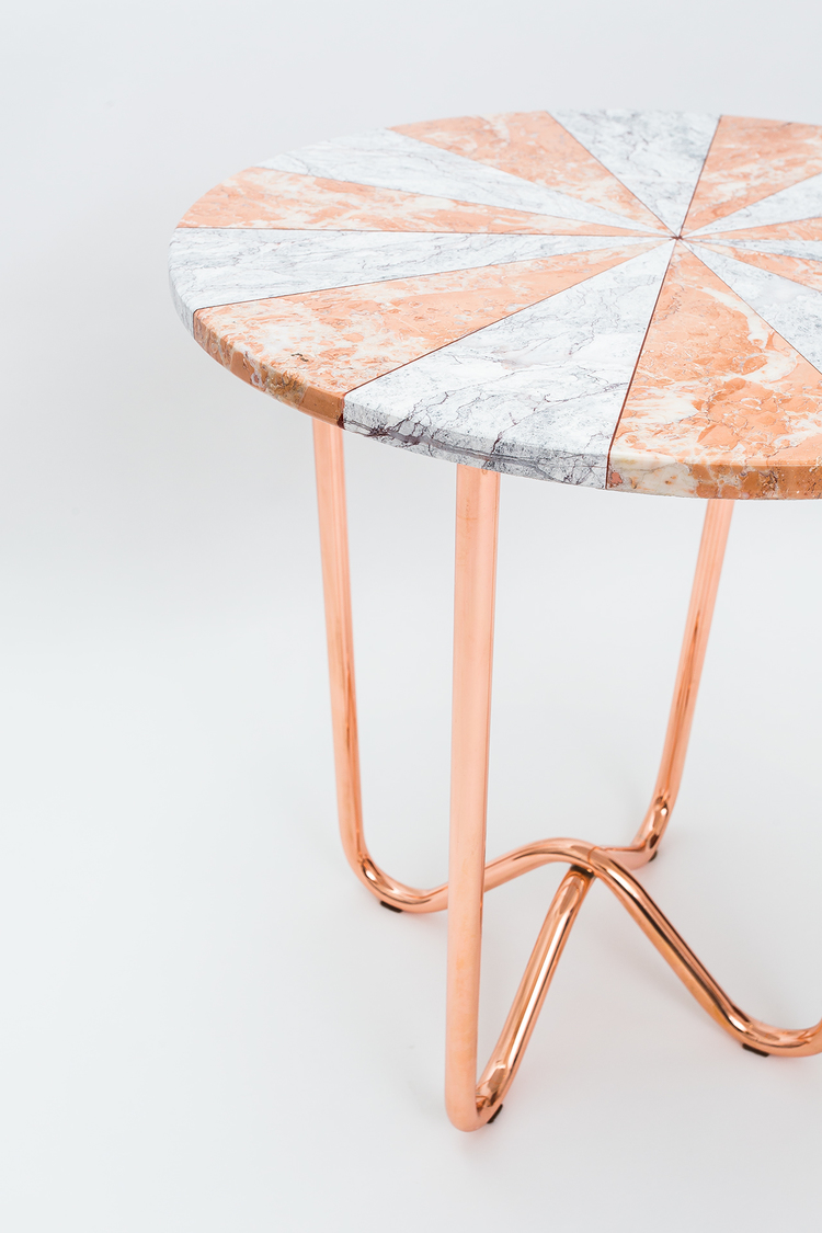 “Jasmine Pizza(茉莉花披萨)”结合了两种不同的大理石和对比鲜明的色彩,完全是手工制作,饰有弧形形铜腿。 “Jasmine Pizza”有不同的大理石,腿部饰面和尺码。