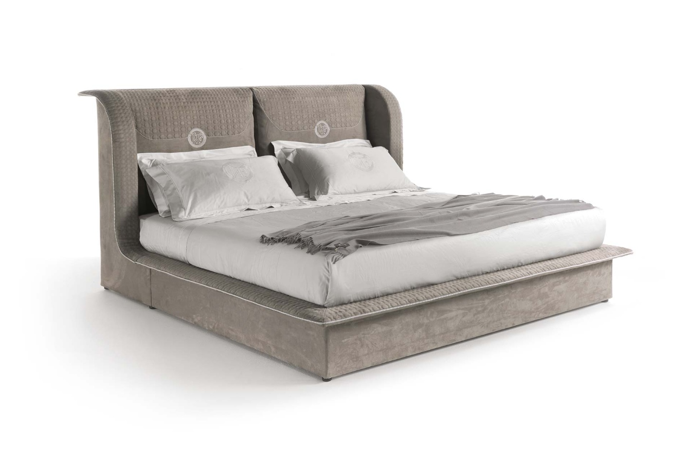 高床头和珍贵的刺绣充实简单的这张床光和现代设计的特征。