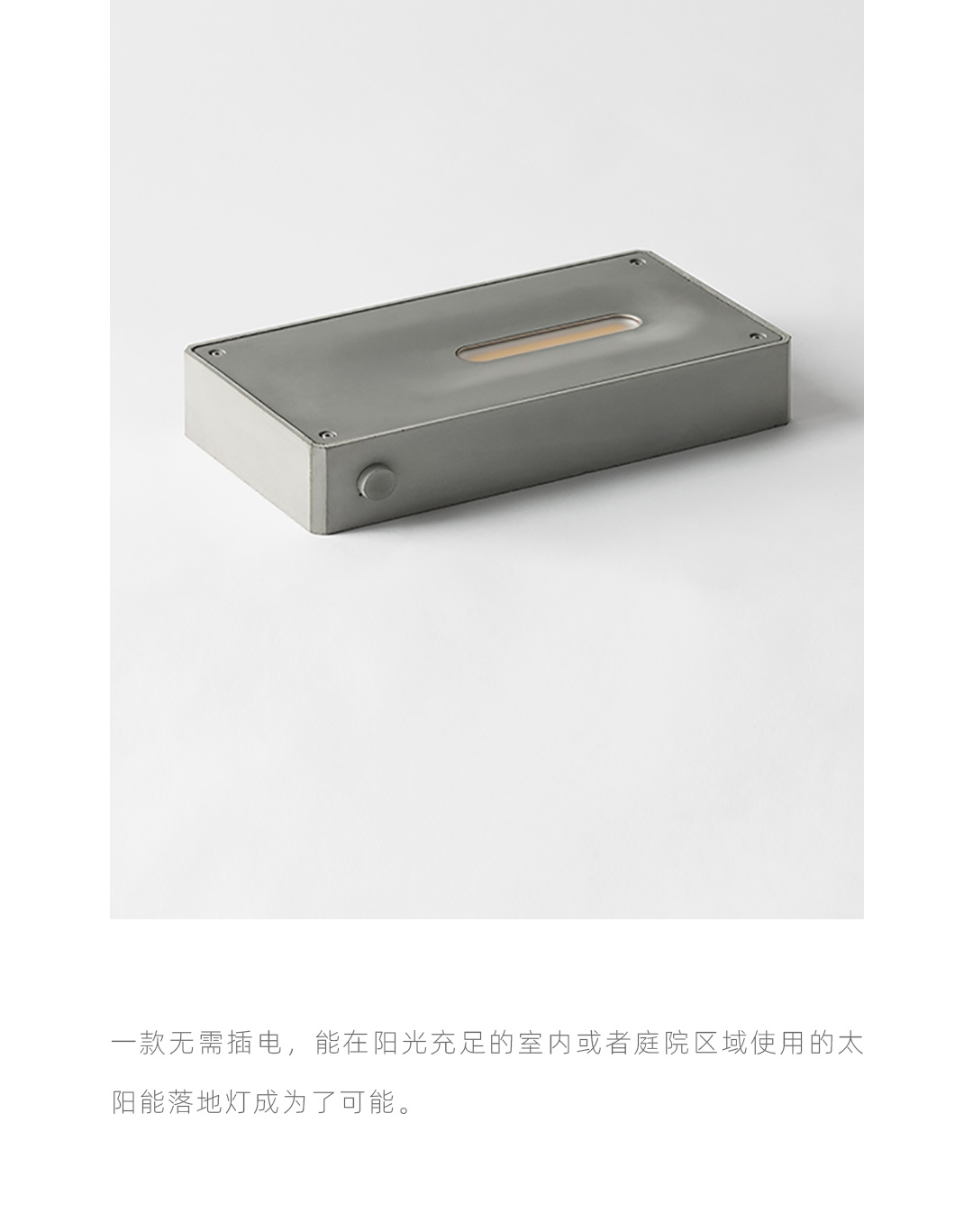 太阳光是最好的可持续能源。随着人对自然采光的心理诉求,无论是办公建筑或是住宅建筑的内部是越来越通透跟开阳,既节省了电力又增添了诗意。 一款无需插电,能在阳光充足的室内或者庭院区域使用的太阳能落地灯成为了可能。 太阳能技术在建筑供电领域上比较成熟,而涉及个体的家居产品并不常见,更多的太阳能家居产品诞生能唤起人们对可持续资源利用的意识,具有现实意义。