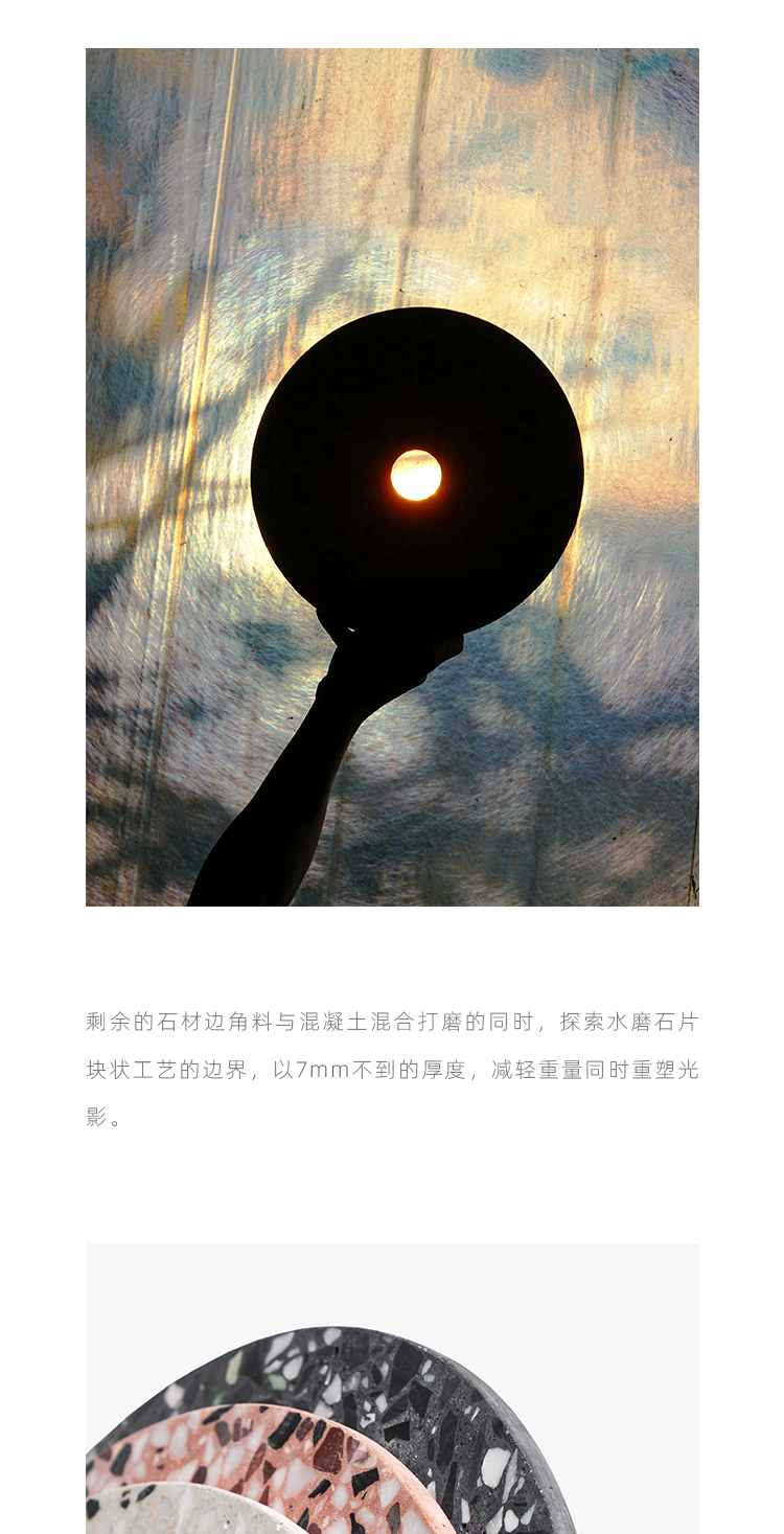 以材质再生为基本手段的水磨石系列,将陶瓷废渣再生成简洁形态的日常性家具,以衍生产业的形式回归到大众层面的使用中。 中国佛山,这片拥有全球最大最成熟的陶瓷产业链和产业集群的建筑陶瓷工厂的土地,承载着每年400万吨陶瓷废弃物带来的环境污染。 以材质再生融入日常,不仅是激发商业价值的大胆尝试,是环保理念的日常化实践,更是对自我尊严的基本坚守和追求,我们探寻陶瓷跨越地域局限的一种当代突破!