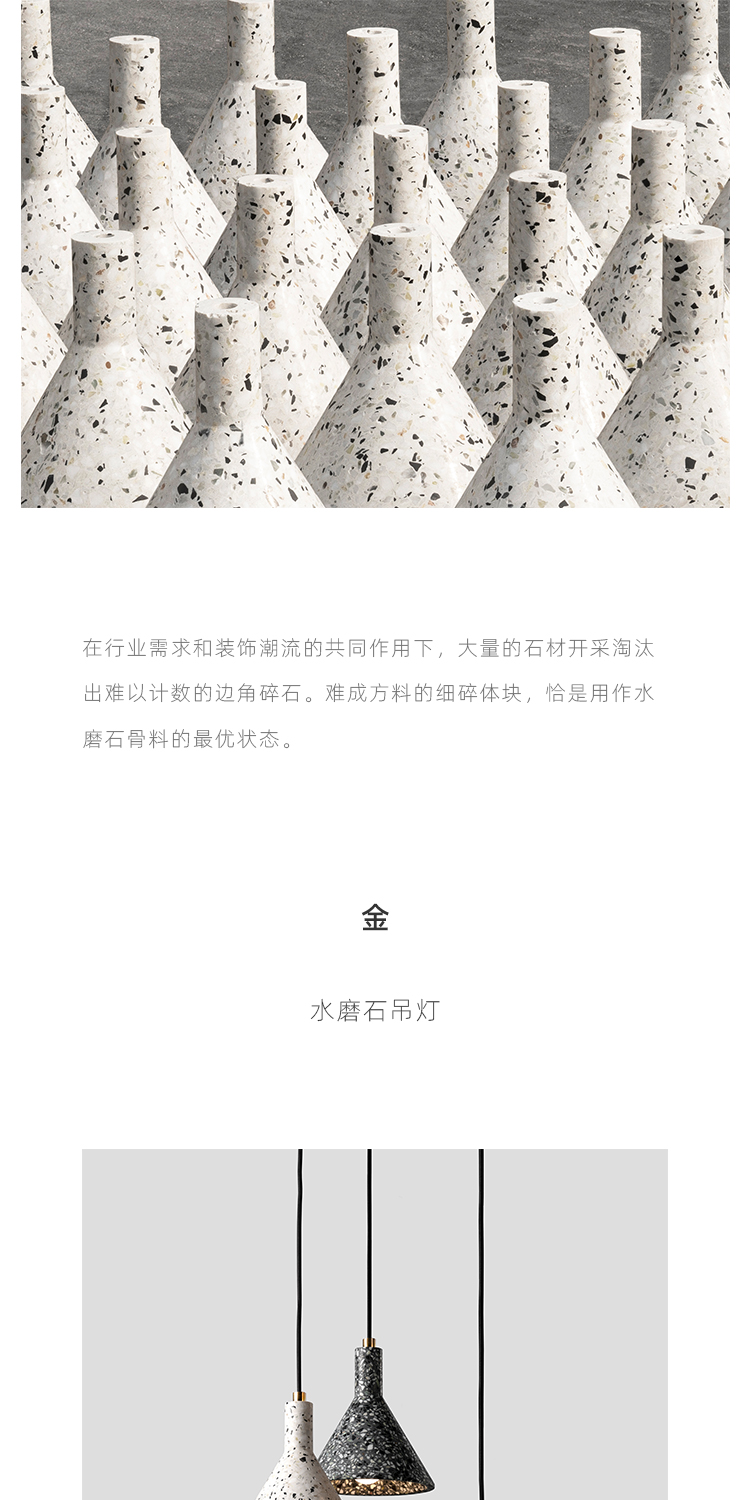 以材质再生为基本手段的水磨石系列,将陶瓷废渣再生成简洁形态的日常性家具,以衍生产业的形式回归到大众层面的使用中。 中国佛山,这片拥有全球最大最成熟的陶瓷产业链和产业集群的建筑陶瓷工厂的土地,承载着每年400万吨陶瓷废弃物带来的环境污染。 以材质再生融入日常,不仅是激发商业价值的大胆尝试,是环保理念的日常化实践,更是对自我尊严的基本坚守和追求,我们探寻陶瓷跨越地域局限的一种当代突破!