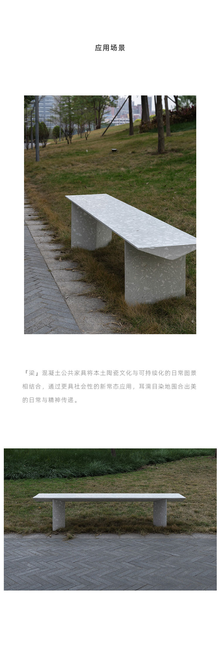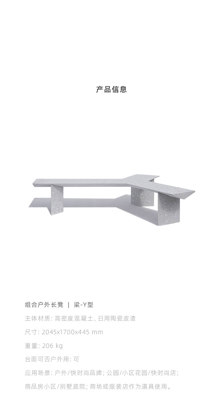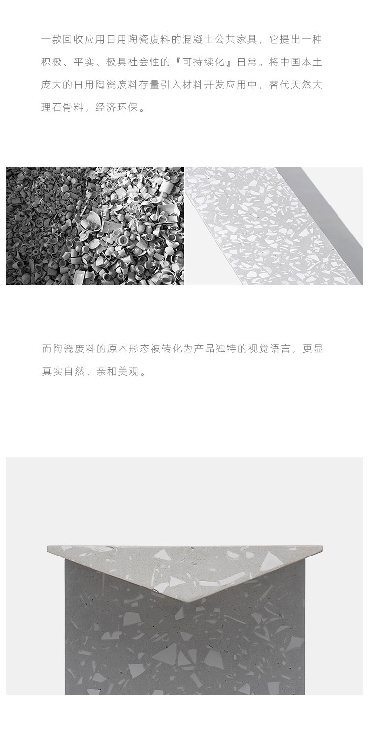 『梁』组合式户外长凳是一款回收应用日用陶瓷废料的混凝土公共家具,它提出一种积极、平实、极具社会性的『可持续化』日常。 将中国本土庞大的日用陶瓷废料存量引入材料开发应用中,替代天然大理石骨料,经济环保;而陶瓷废料的原本形态被转化为产品独特的视觉语言,更显真实自然。