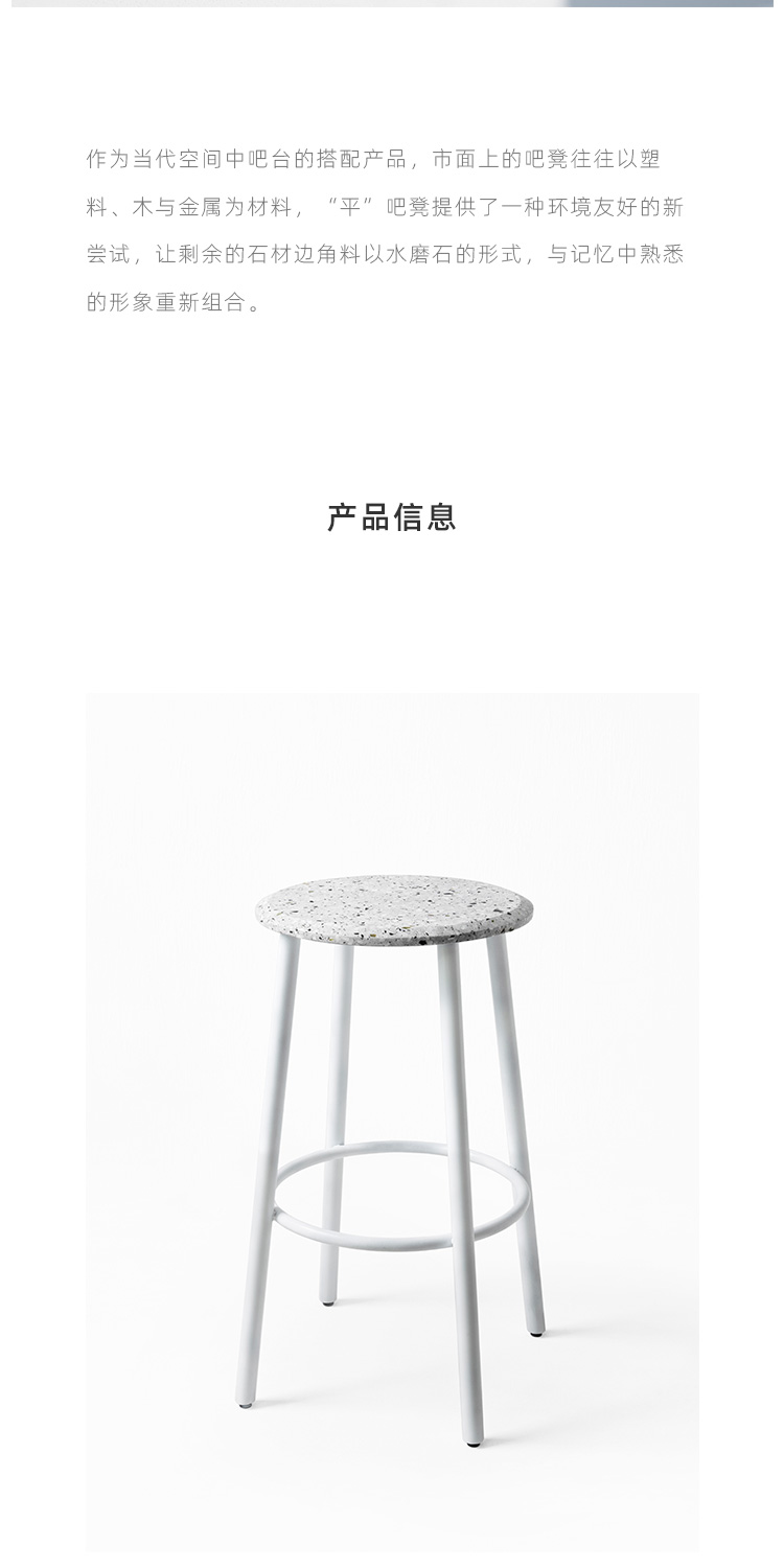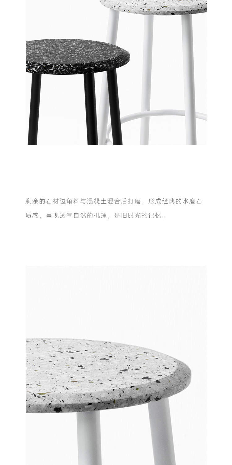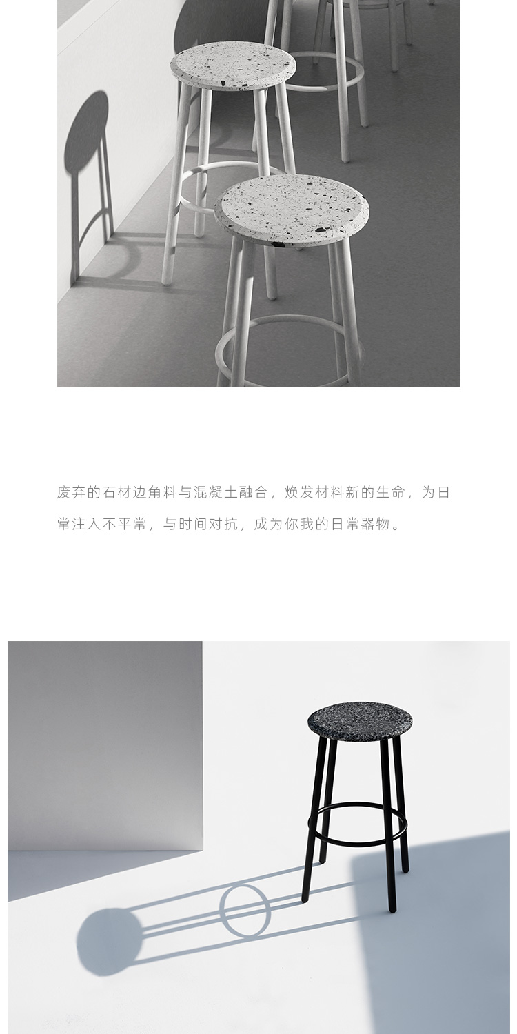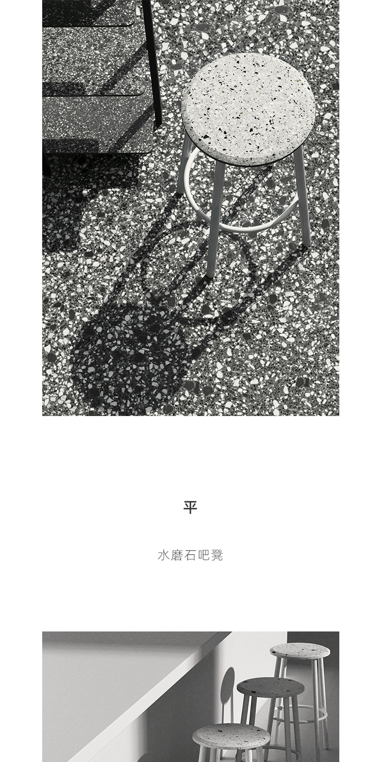 以材质再生为基本手段的水磨石系列,将陶瓷废渣再生成简洁形态的日常性家具,以衍生产业的形式回归到大众层面的使用中。 中国佛山,这片拥有全球最大最成熟的陶瓷产业链和产业集群的建筑陶瓷工厂的土地,承载着每年400万吨陶瓷废弃物带来的环境污染。 以材质再生融入日常,不仅是激发商业价值的大胆尝试,是环保理念的日常化实践,更是对自我尊严的基本坚守和追求,我们探寻陶瓷跨越地域局限的一种当代突破!