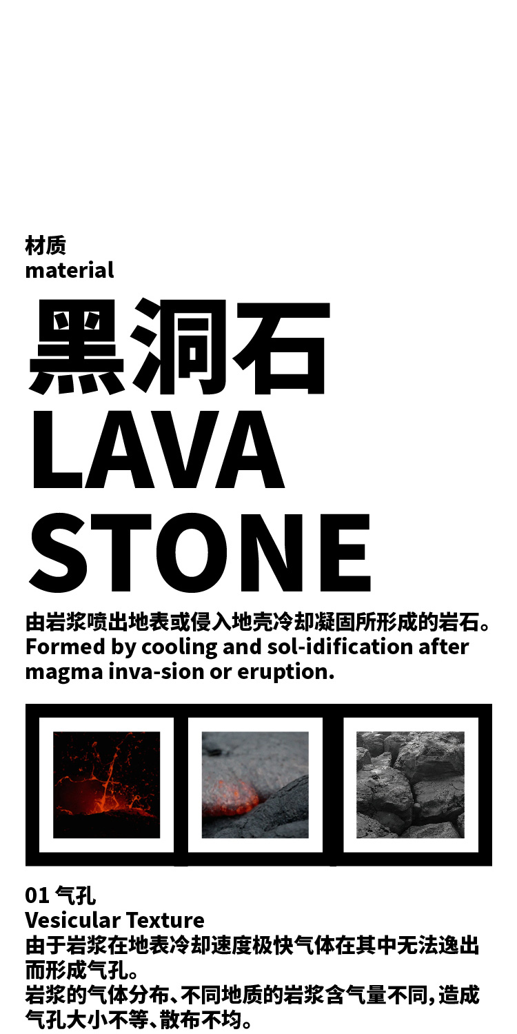 洞黑系列,洞悉秘密,来自地心的喷发。极想把洞石的芳华寂寞倾述出来,呈现于日常并使用它。尝试将洞石塑造各种形态,原材,呈浅灰色;亚光,颜色渐渐加黑;抛光,纯黑了。三种状态,魅力各异。深入践行,洞石的特性愈显,吸音、防水、防火、保温、隔热,耐酸碱、耐腐蚀、耐沾污、耐霉变,且无污染,无放射性。惊喜不断,质量很轻的洞石,居然强度很高,轻、硬,可塑性强,气孔式的通透,赋予了极简中的奢华。触目的拙,爱不释手。