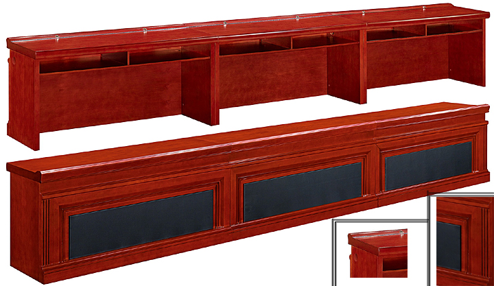 ※  上图为系列配套主席台的展示,以及配套的大班椅,主席台配带写字板皮垫,以及前挡板精湛的雕花工艺;