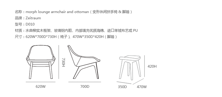 德国家具厂牌 ZEITRAUM 讲究的不仅仅是家具,它着重的是一种"生活态度",每件 ZEITRAUM 家具除了需具备实用、耐用、容易搭配的基本要件,更重要的是可以衬托用户与空间的个性,简约取代夸张花俏的线调,细腻精巧的做工低调传递设计师缜密的设计思维。ZEITRAUM 使用来自永续森林的落叶型硬木,表面以有机油/蜡涂装,完全不使用化学物质,让用户与家具在空间自由呼吸。具有高舒适性和稳定性的 Morph系列休闲椅,由丹麦设计工作室Formstelle设计,结合实木脚架搭配层压板椅座,其流畅且精致的外观造型,只需要一个很小的区域便能散发出简约低调的质朴美感。