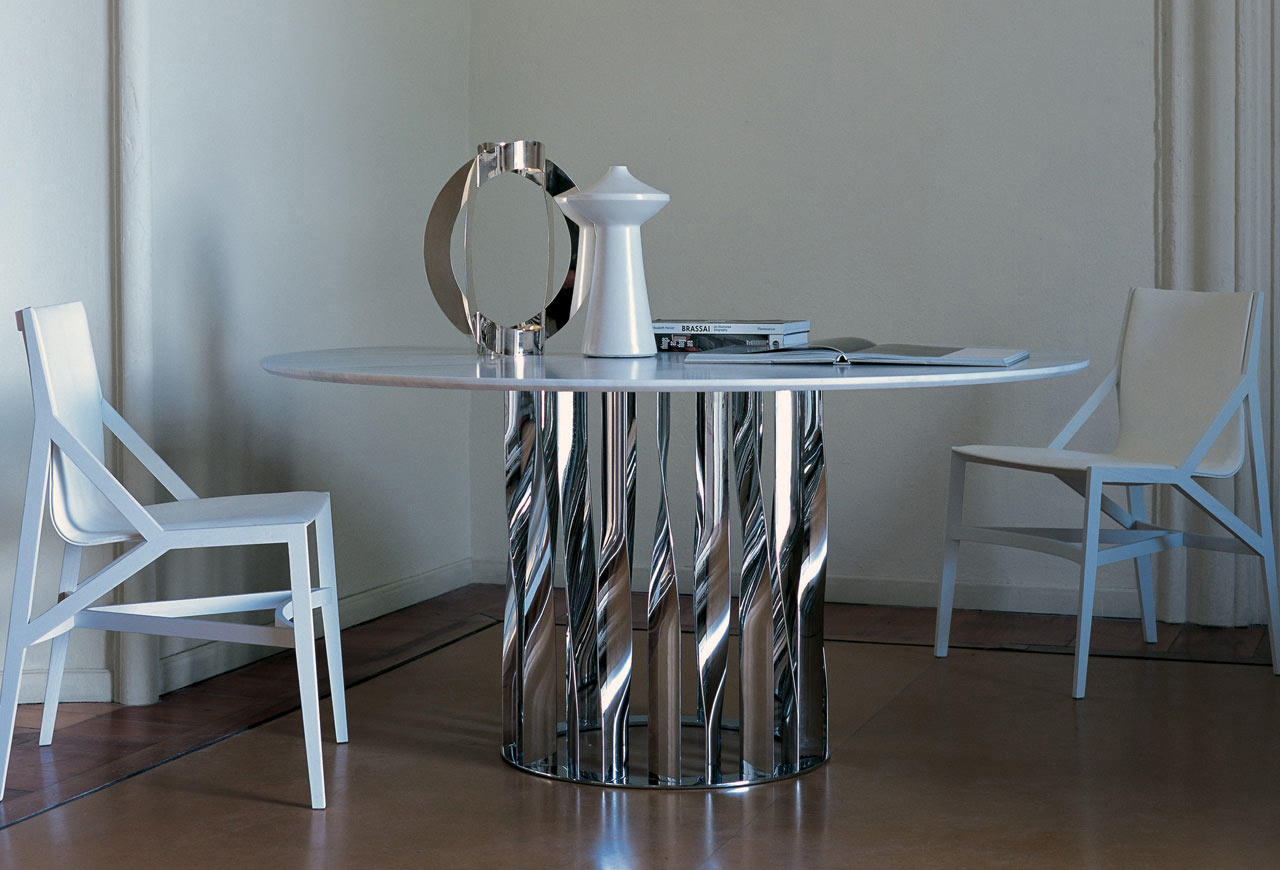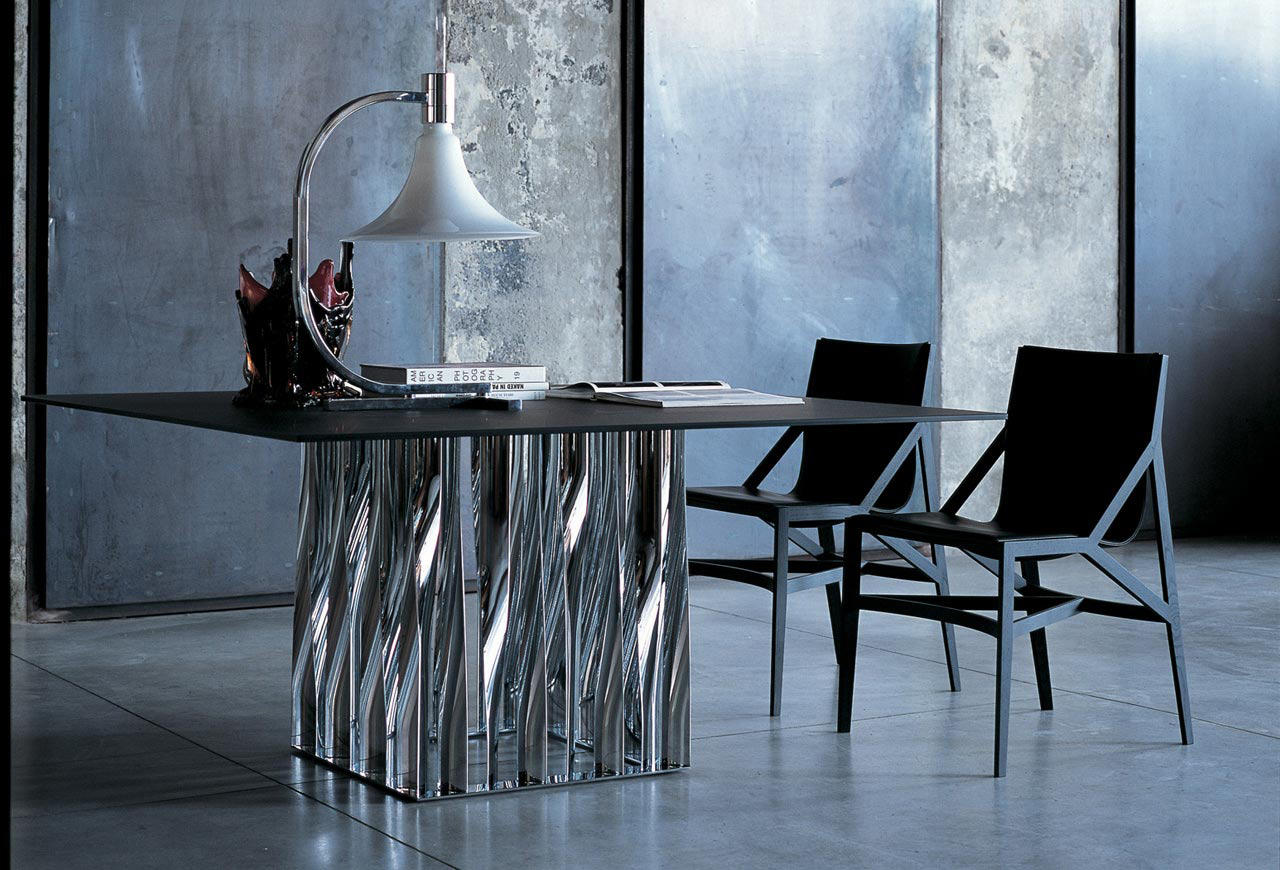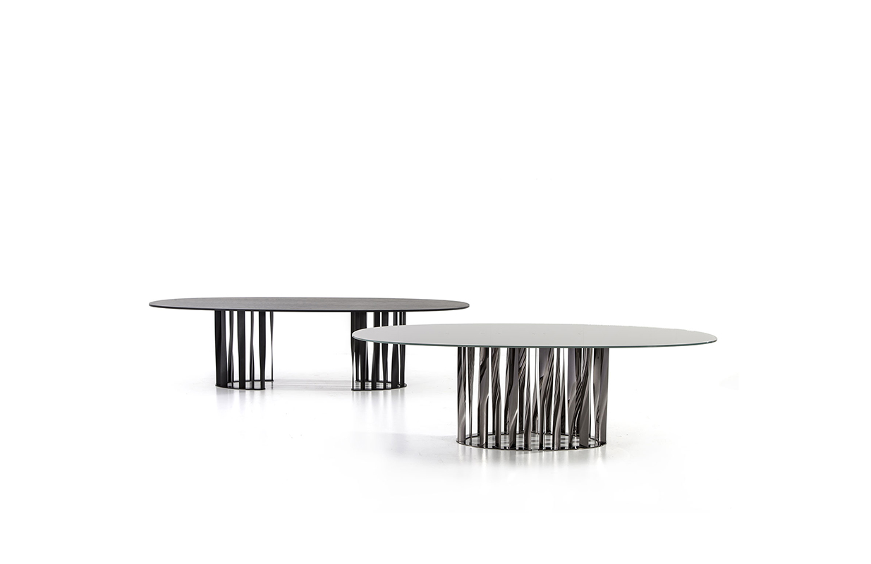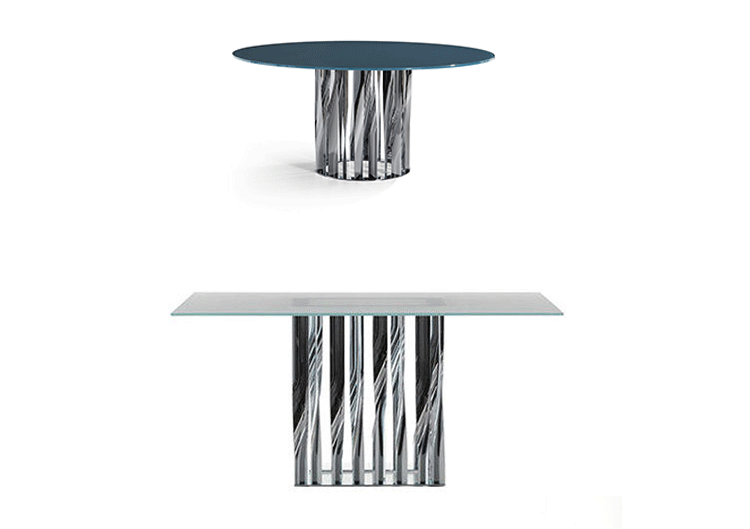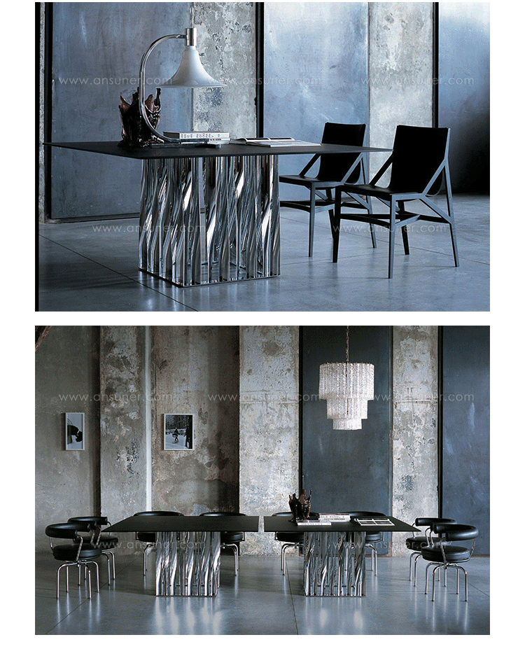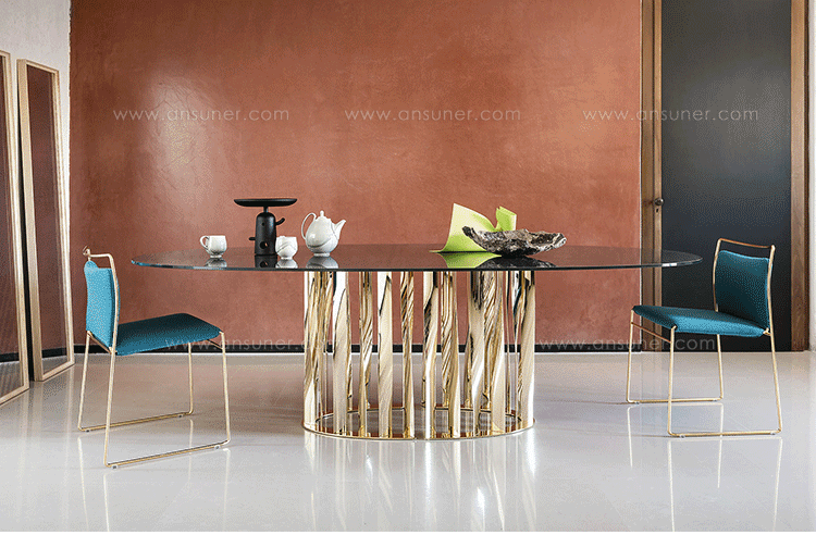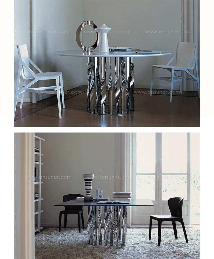 不锈钢电镀折叠而成独特脚架——大胆挑战由薄金属垂直条、微扭纵轴形成的桌几支撑,为家庭创造一个独特的景观