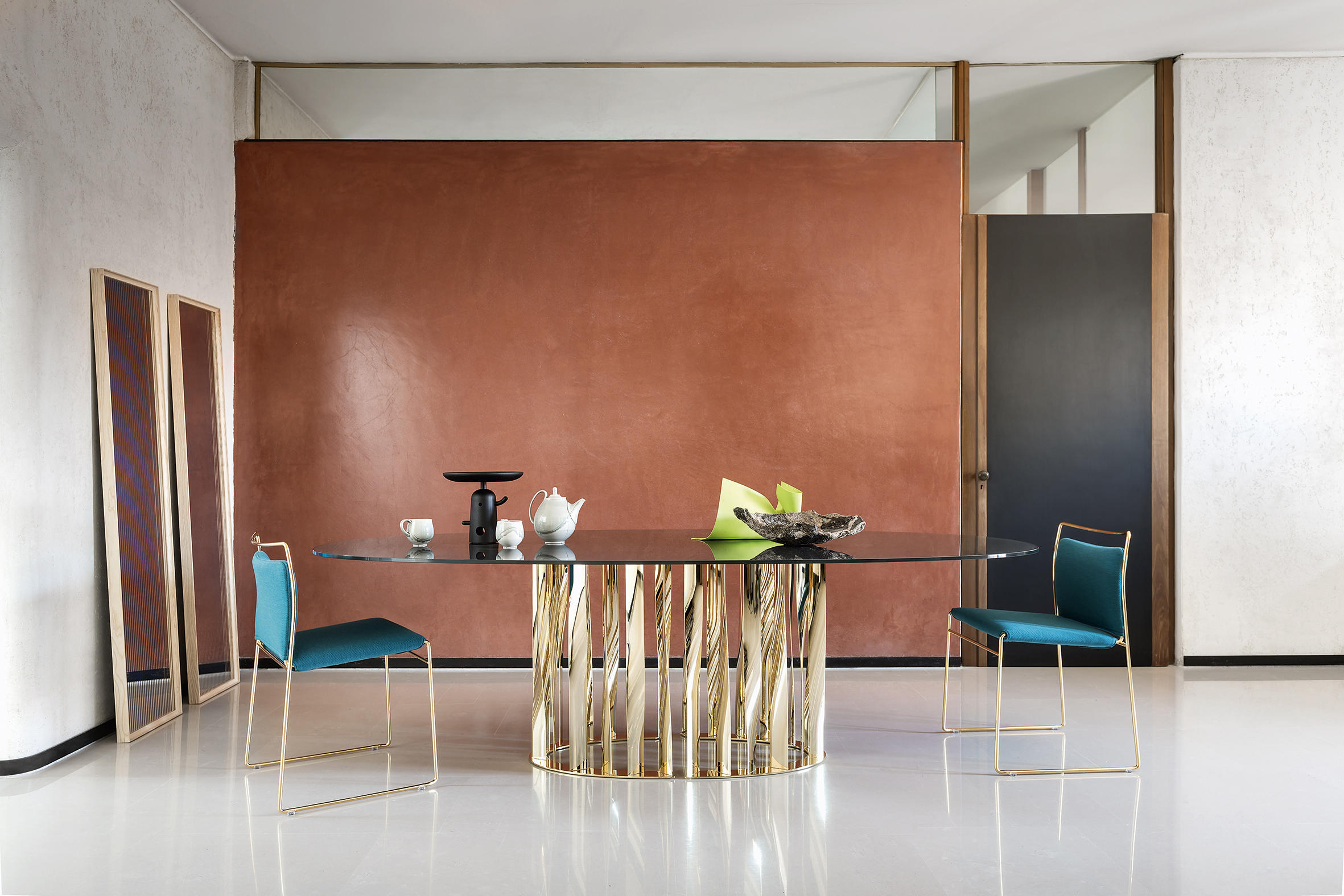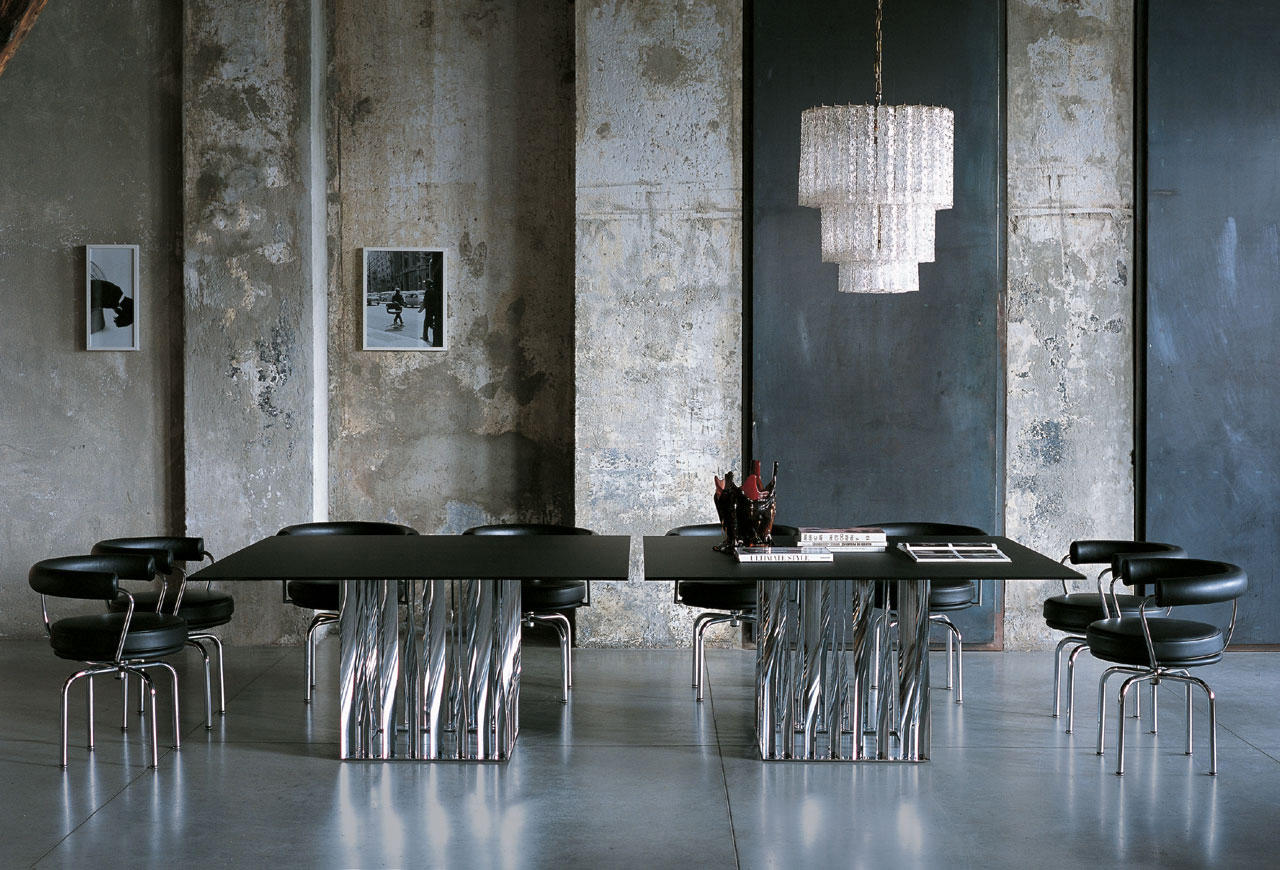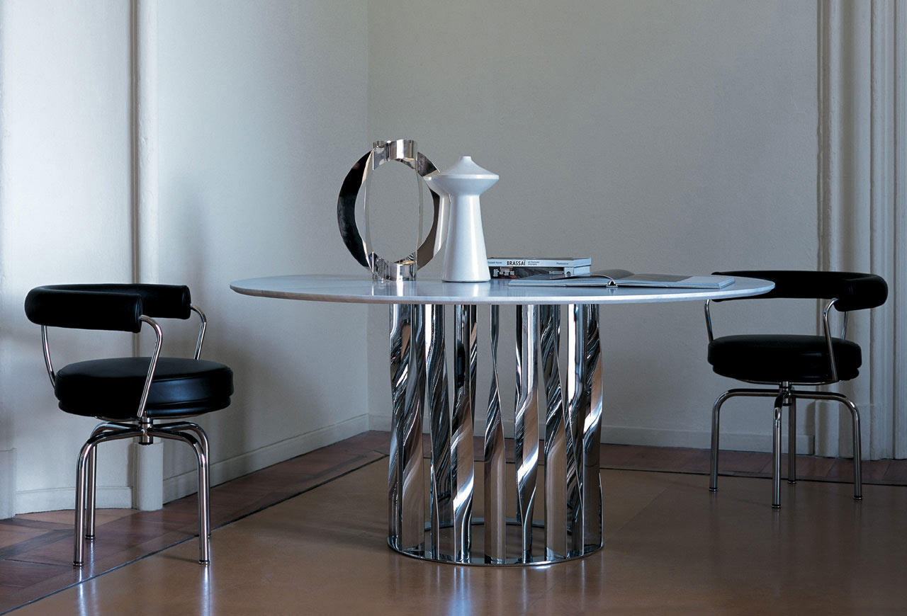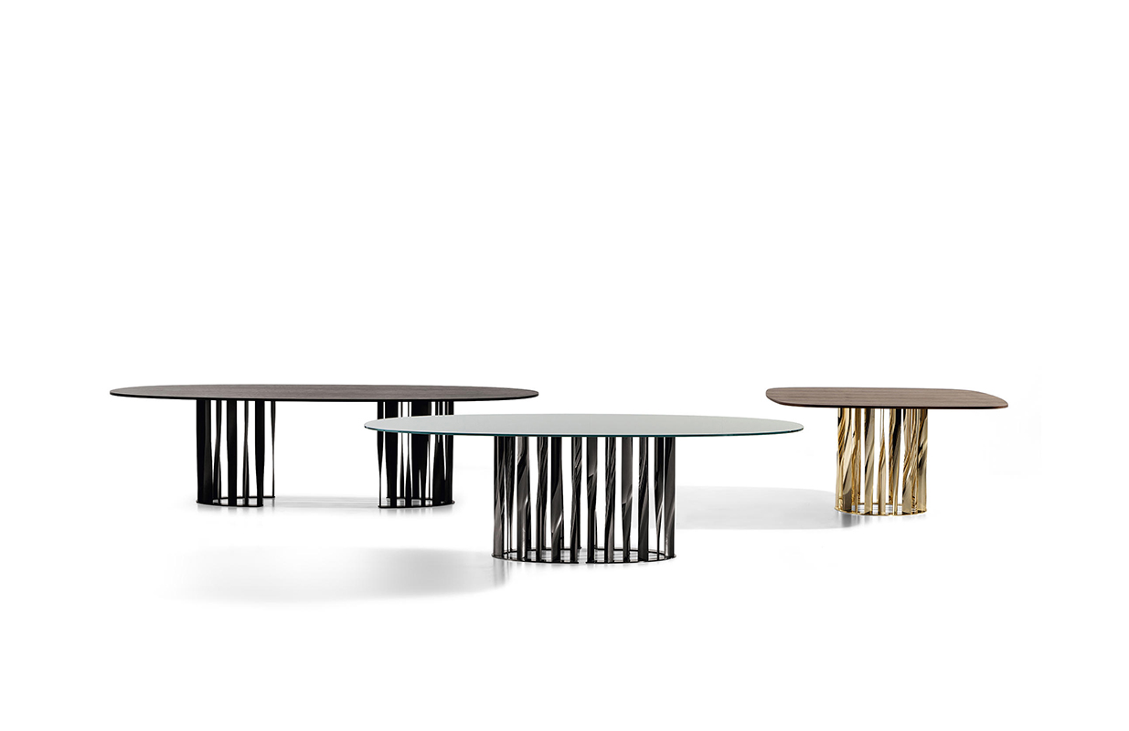 不锈钢电镀折叠而成独特脚架——大胆挑战由薄金属垂直条、微扭纵轴形成的桌几支撑,为家庭创造一个独特的景观