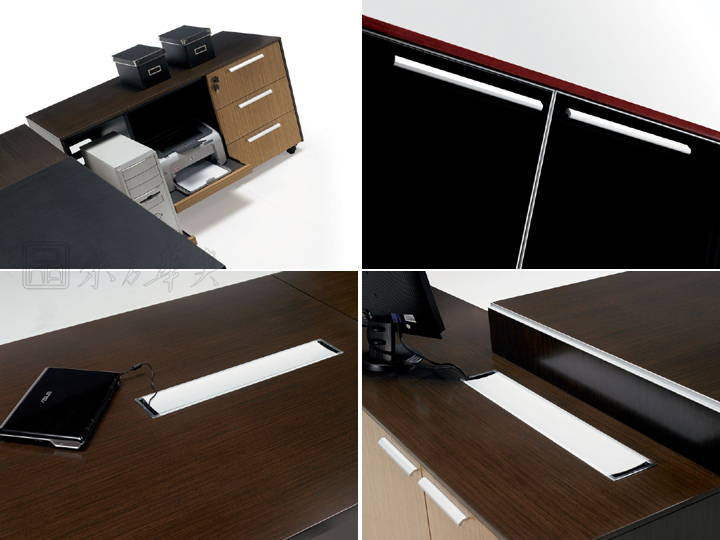 ※ 2200MM长附柜,预设多功能线路管理系统,使得班台拥有强大文件储存功力,并保障现代办公自动化需求。 ※ 附件除抽屉外,带有抽拉式打印机,主机空格,人性设计,让每一设计都起到得要作用。