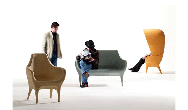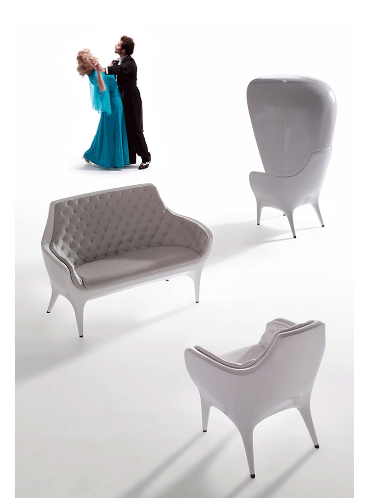 Showtime Poltronas 沙發系列是 Jaime Hayon 受邀與西班牙頂尖設計家具公司 BD Barcelona 合作推出的精品級藝術家具系列,靈感來自於米高梅歌舞劇場景,從單人沙發、雙人沙發 發展到最具趣味性的圓頂高背沙發椅,讓人坐進去就像是身處於古代歐洲戲院的包廂中,而外面的人只能看到一雙伸出的腿,充滿戲劇性的設計,不僅多了一份神秘感,,更令人不禁莞爾。