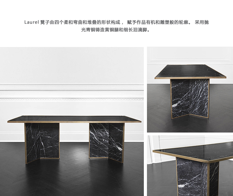 Liaison餐桌具有永恒性和现代感,又体现了凯利对混合材料的热爱。 这款优雅而简约的桌子由巨大的磨砂和密封的黑色Marquina大理石平面组成,饰有古董青铜边缘细节。