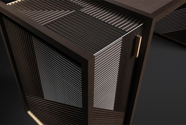 凭借其功能性设计,这款灵活的复古风格橱柜营造出简约的几何形状,并在完整空间和空间之间实现完美平衡 典型的表面处理采用交织的橡木编织,手工打磨和涂漆,具有极佳的视觉冲击力。