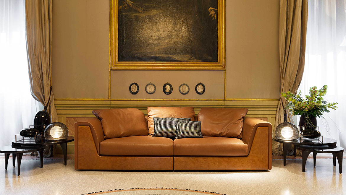 Parchment ivory colour glossy finishing or Emperador Dark marble, wooden feet covered in Allia leather