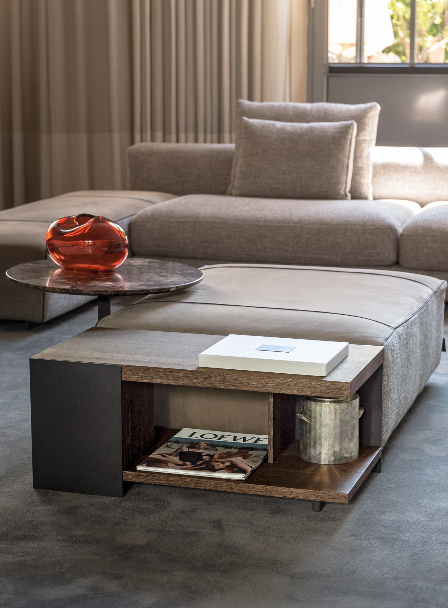 Noth桌子可以为客厅提供功能性和现代风格。金属结构是由云母棕色、氧基灰色或黑色的镍制成,用于固定由莫卡橡木、柚檀木或光泽乌木制成的桌面。开放的空间和几何设计,使Noth桌子可随意的安放在客厅或和沙发进行搭配。
