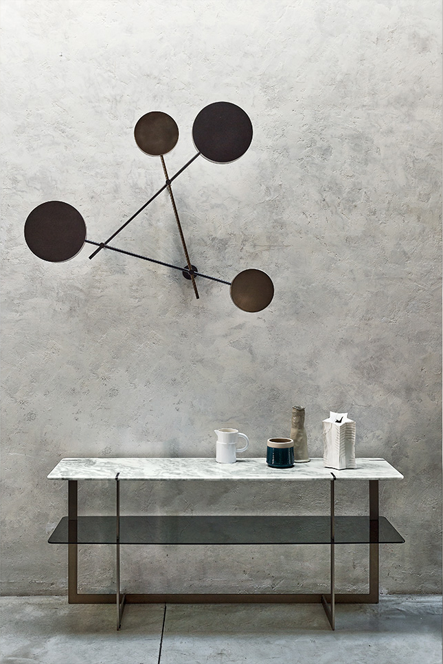 Iride是一个线条和圆圈的雕塑,几何形状的强烈的装饰效果,让你想起了康定斯基年代作品。圆盘形成了一个类似于日食的发光的光环。交错的结构是由三个圆盘和三个云母棕色金属棒和一个钛金属圆盘和棒制成。